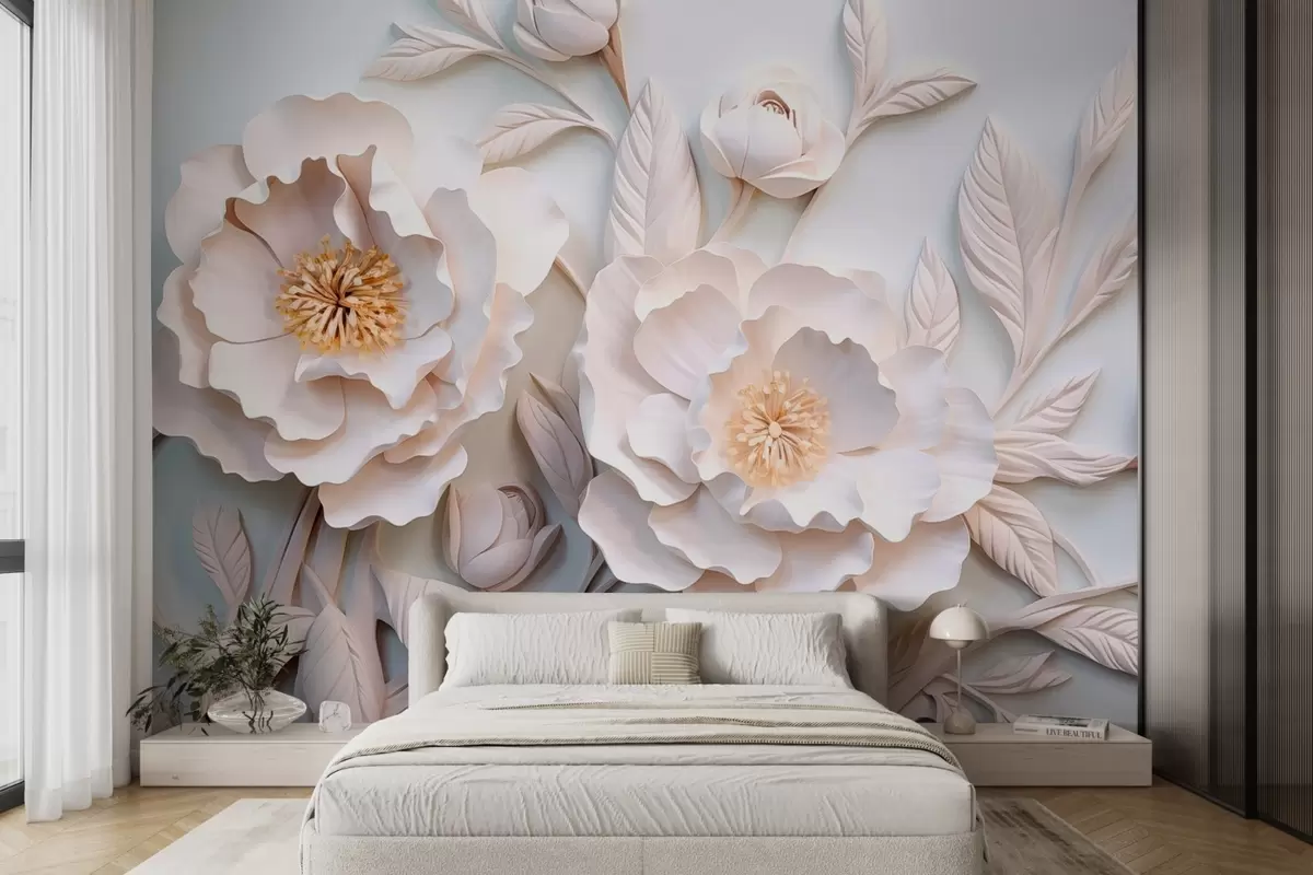 Fotomurales peonías en relieve 3D al fresco con acento amarillo Nr. w08967