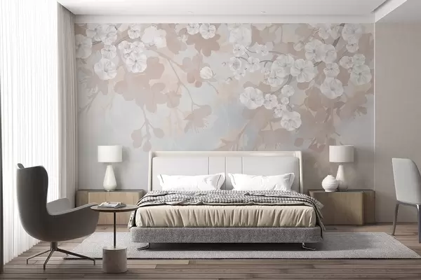 Fotomurales Ramas de cerezo en flor con flores blancas y hojas grises, sobre elegantes siluetas florales en suaves colores pastel Nr. w08973