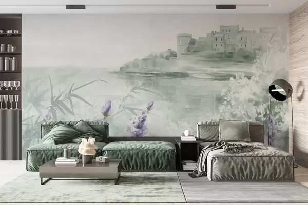 Fotomurales Paisaje vintage texturizado con un castillo sobre un acantilado con vistas al mar, con flores de lavanda en colores apagados Nr. w08975