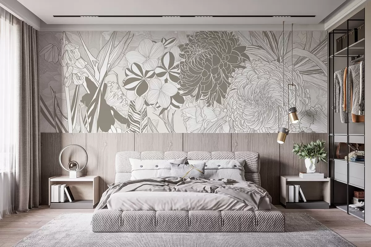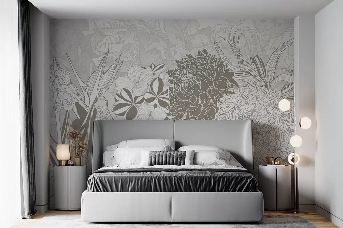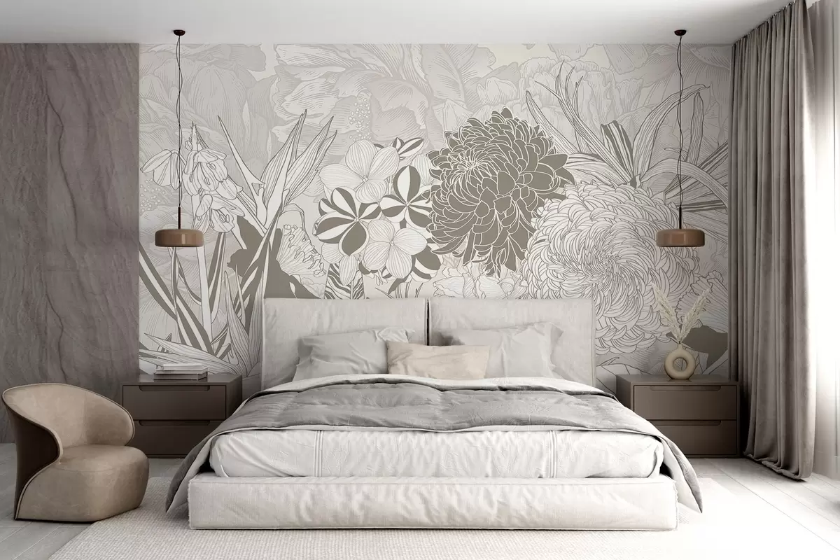 Fotomurales Flores y hojas en tonos beige, incluidos crisantemos, plumeria y follaje tropical, diseño botánico Nr. w08976