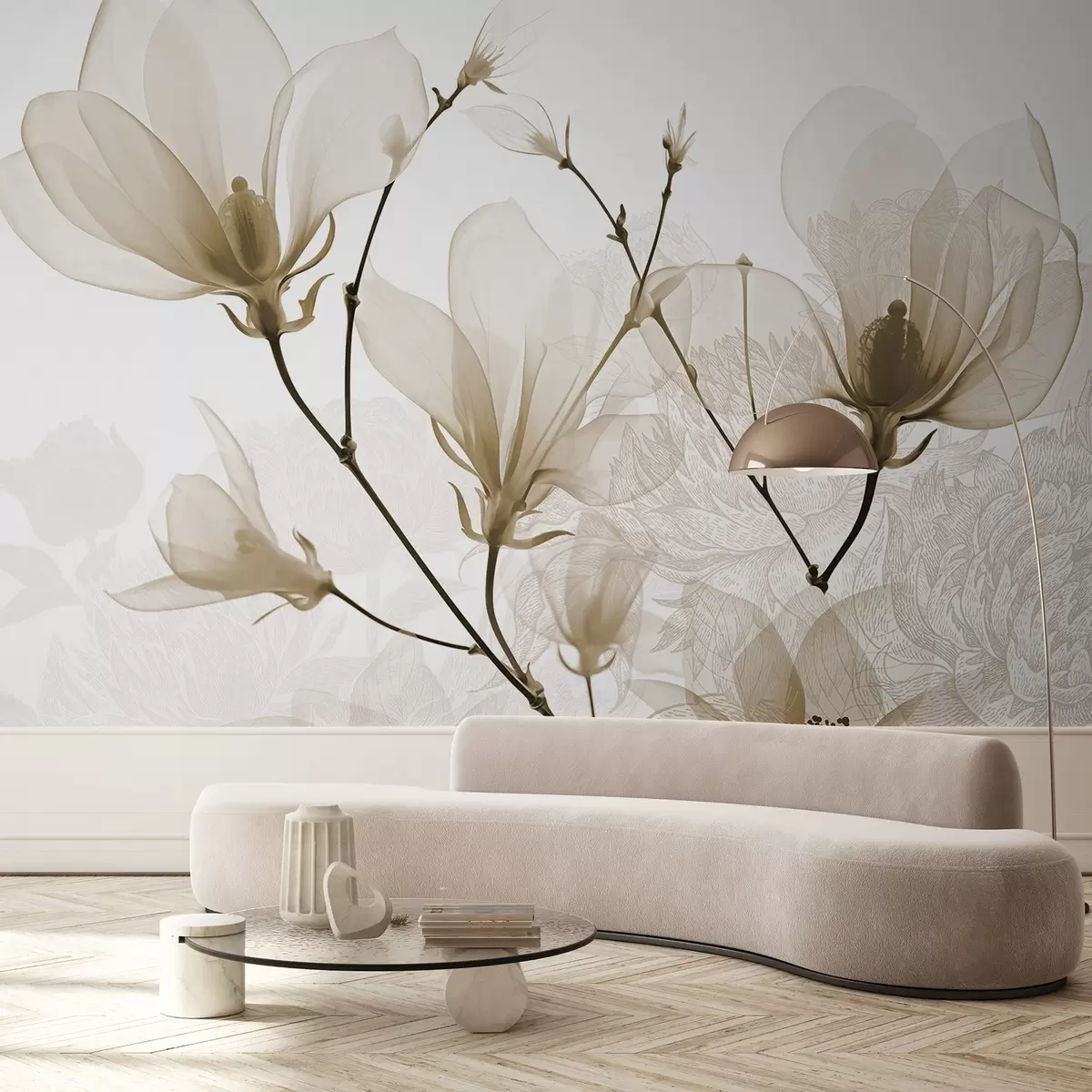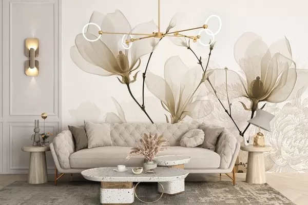 Fotomurales Flores de magnolia de color beige translúcido con siluetas de flores de delicados pétalos y tallos oscuros Nr. w08978v1