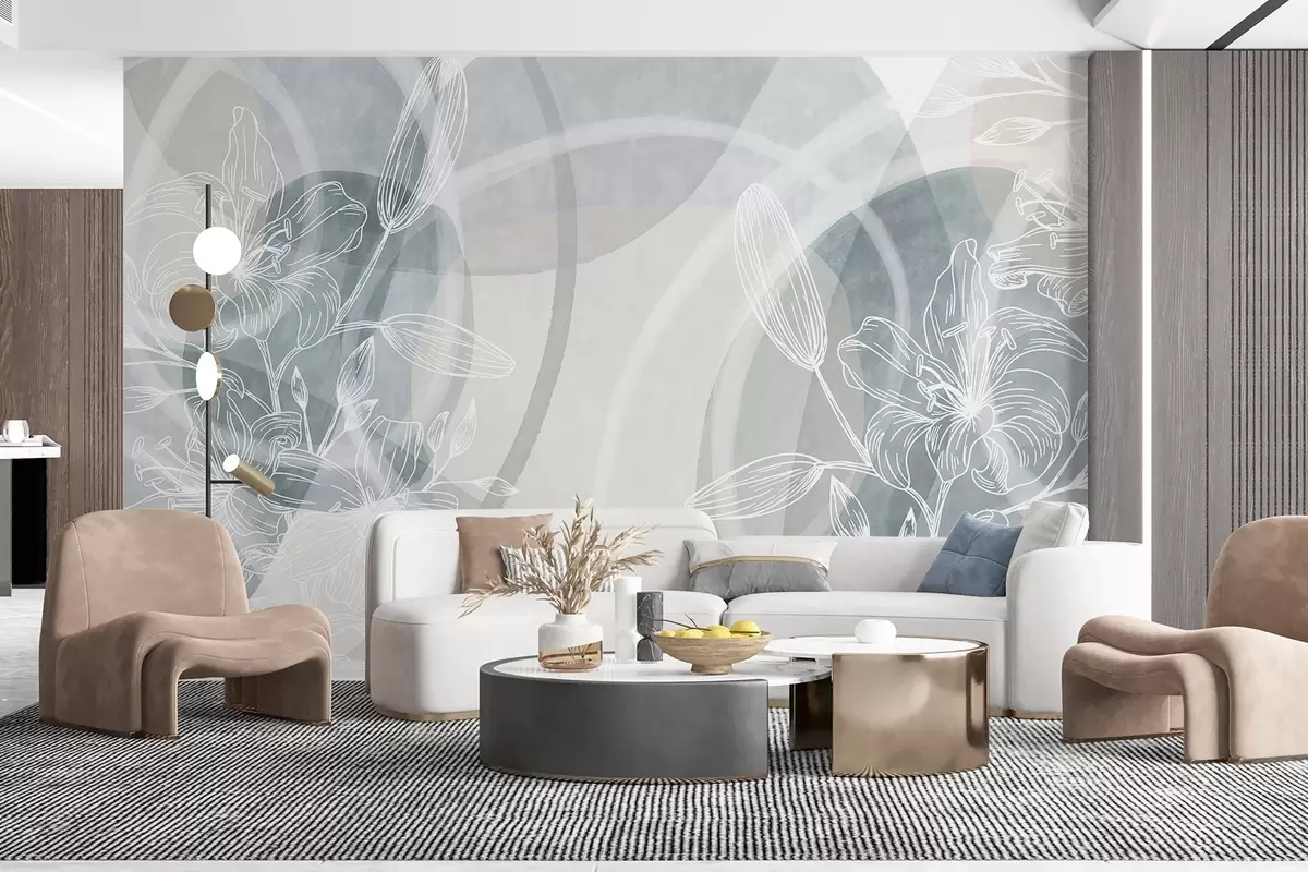 Fotomurales Diseño floral minimalista con flores y hojas blancas, círculos abstractos superpuestos en tonos grises y azules Nr. w08979