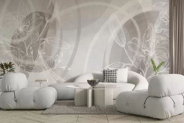 Fotomurales Diseño floral minimalista con flores y hojas blancas, círculos abstractos superpuestos en tonos beige y azul Nr. w08979v1