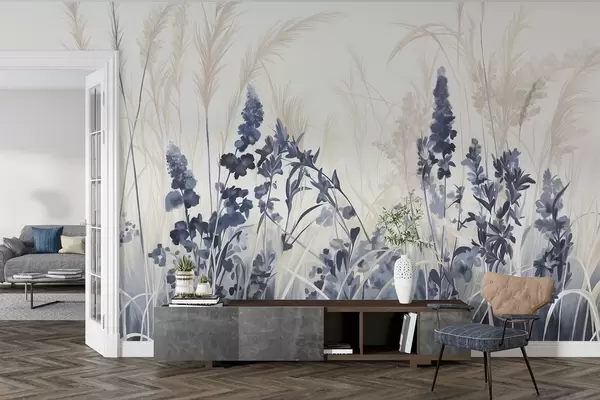 Fotomurales Flores azules y juncos beige en un campo, textura de pintura minimalista, fondo claro, colores suaves, pinceladas delicadas Nr. w08982