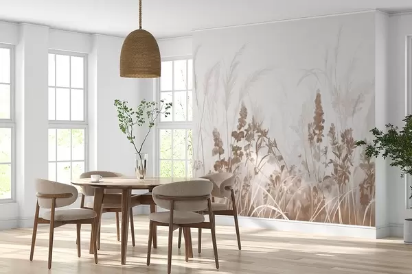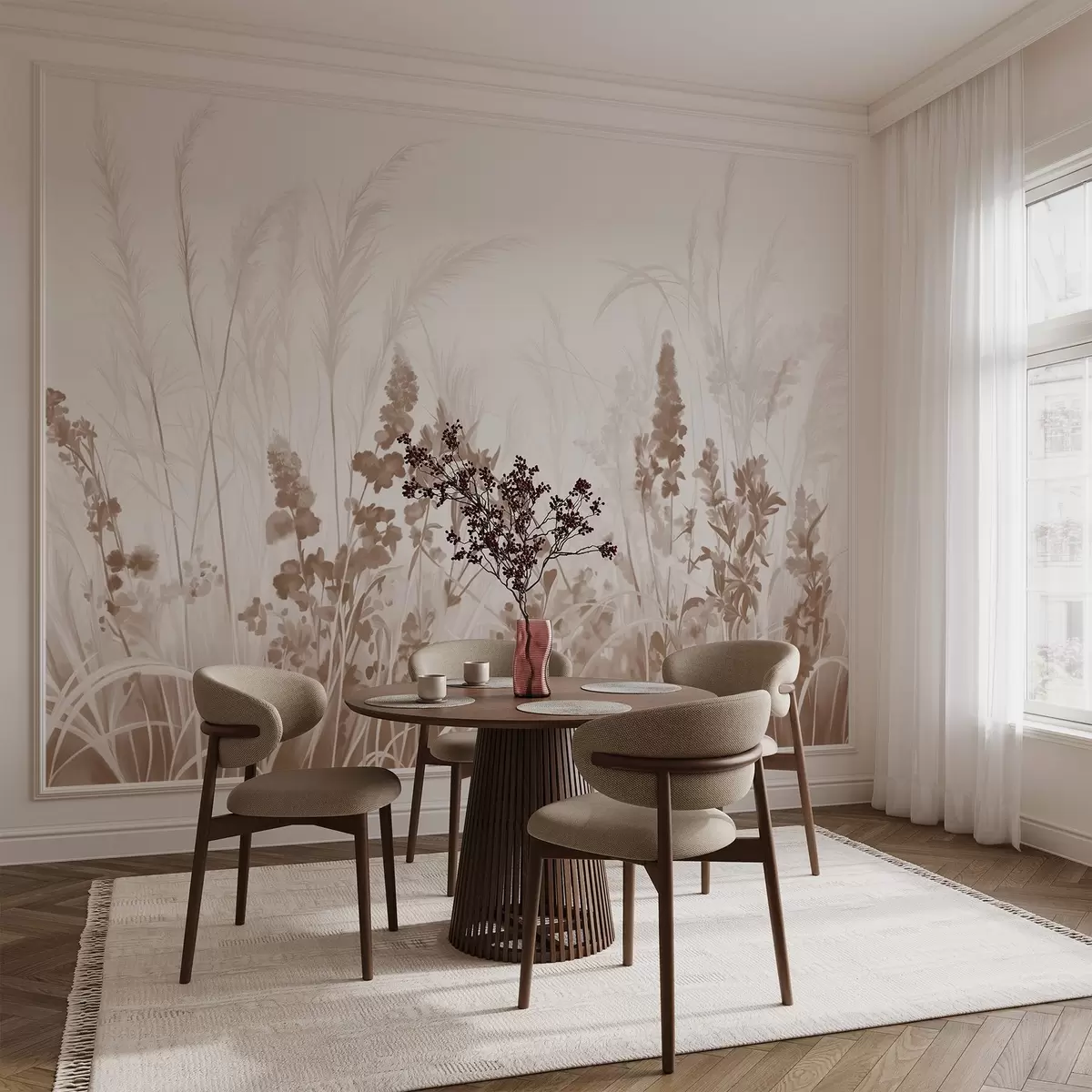 Fotomurales Flores marrones y juncos beige en un campo, textura de pintura minimalista, fondo claro, colores suaves, pinceladas delicadas Nr. w08982v1