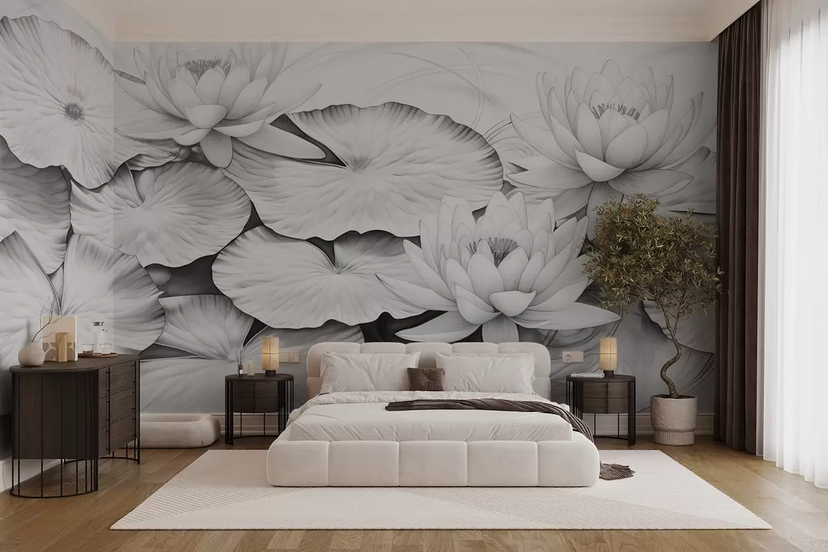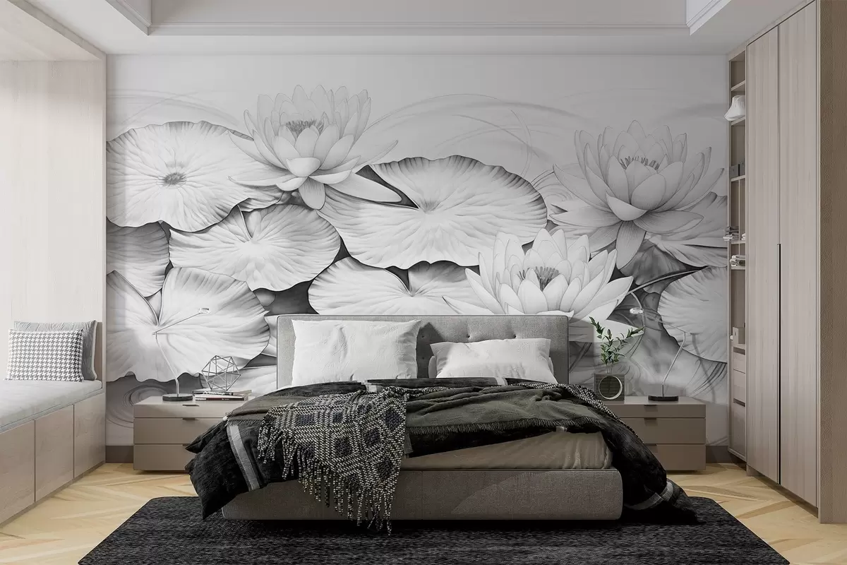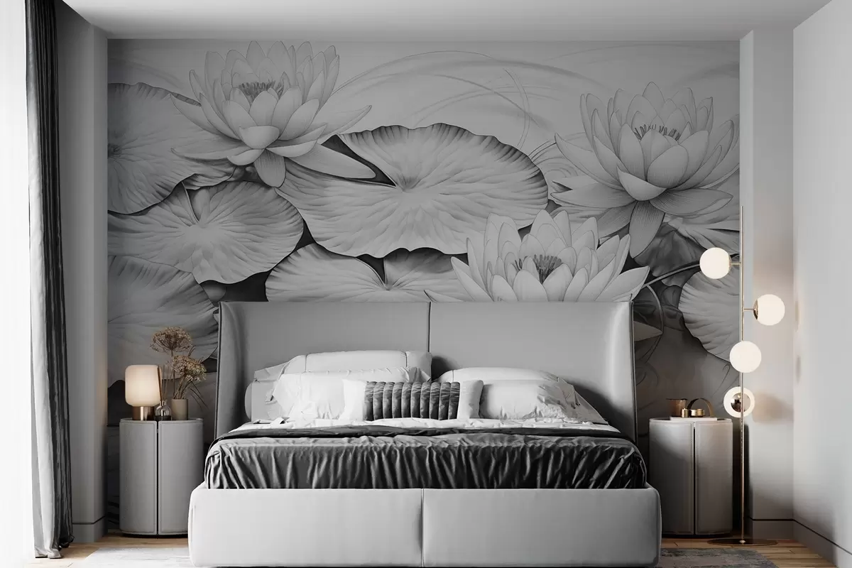 Fotomurales Nenúfares y nenúfares en un estanque, imitación en blanco y negro de dibujo a lápiz, ilustración botánica detallada, arte de la naturaleza Nr. w09006