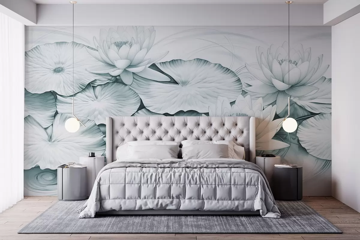 Fotomurales Nenúfares y nenúfares en un estanque, turquesa y blanco imitación de dibujo a lápiz, ilustración botánica detallada, arte de la naturaleza Nr. w09006v1