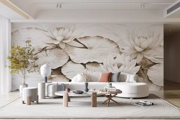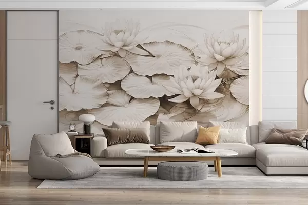 Fotomurales Nenúfares y nenúfares en un estanque, marrón y blanco imitación de dibujo a lápiz, ilustración botánica detallada, arte de la naturaleza Nr. w09006v2