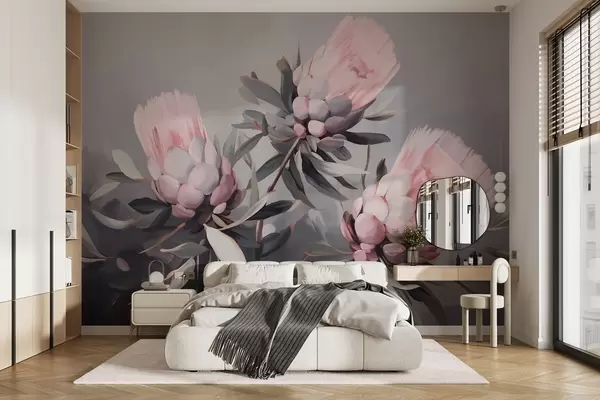 Fotomurales Flores abstractas de protea rosa con hojas grises, pinceladas de textura suave, colores apagados, sobre fondo gris difuminado Nr. w09014