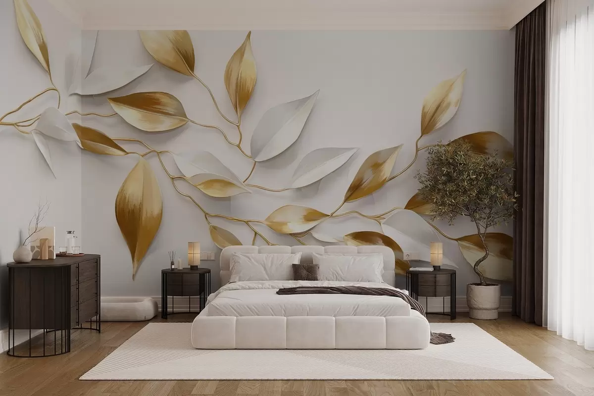 Fotomurales Hojas amarillas y blancas sobre una rama , diseño elegante, fondo blanco, estilo minimalista, arte decorativo , inspirado en la naturaleza Nr. w09015