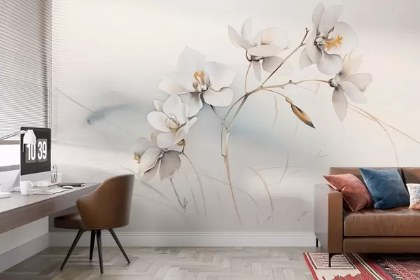 murales de pared Rama de orquídea blanca en estilo acuarela w09022