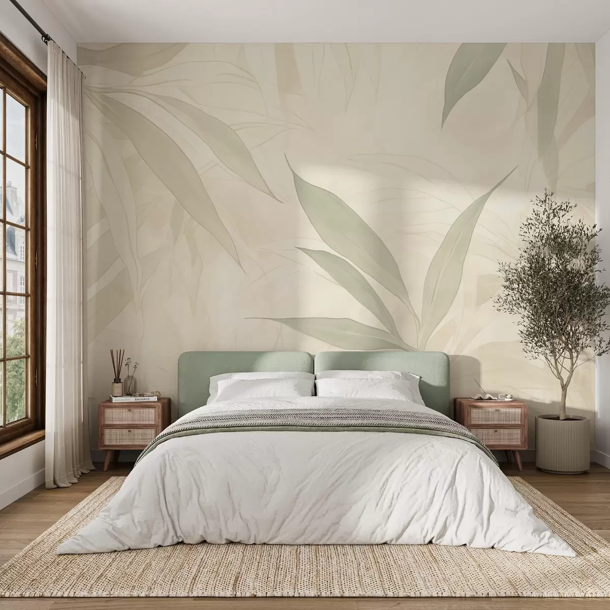 Fotomurales Ramas con hojas en suaves tonos verdes sobre fondo beige Nr. w09027