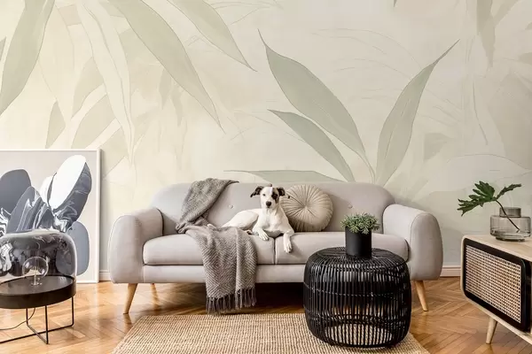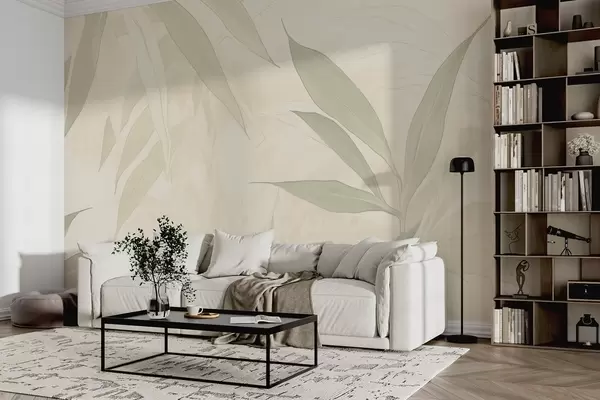 Fotomurales Ramas con hojas en suaves tonos verdes sobre fondo beige Nr. w09027