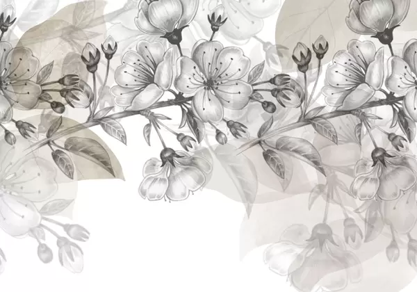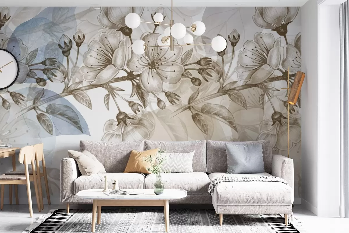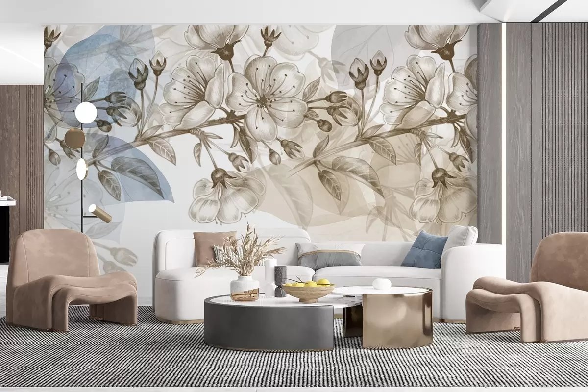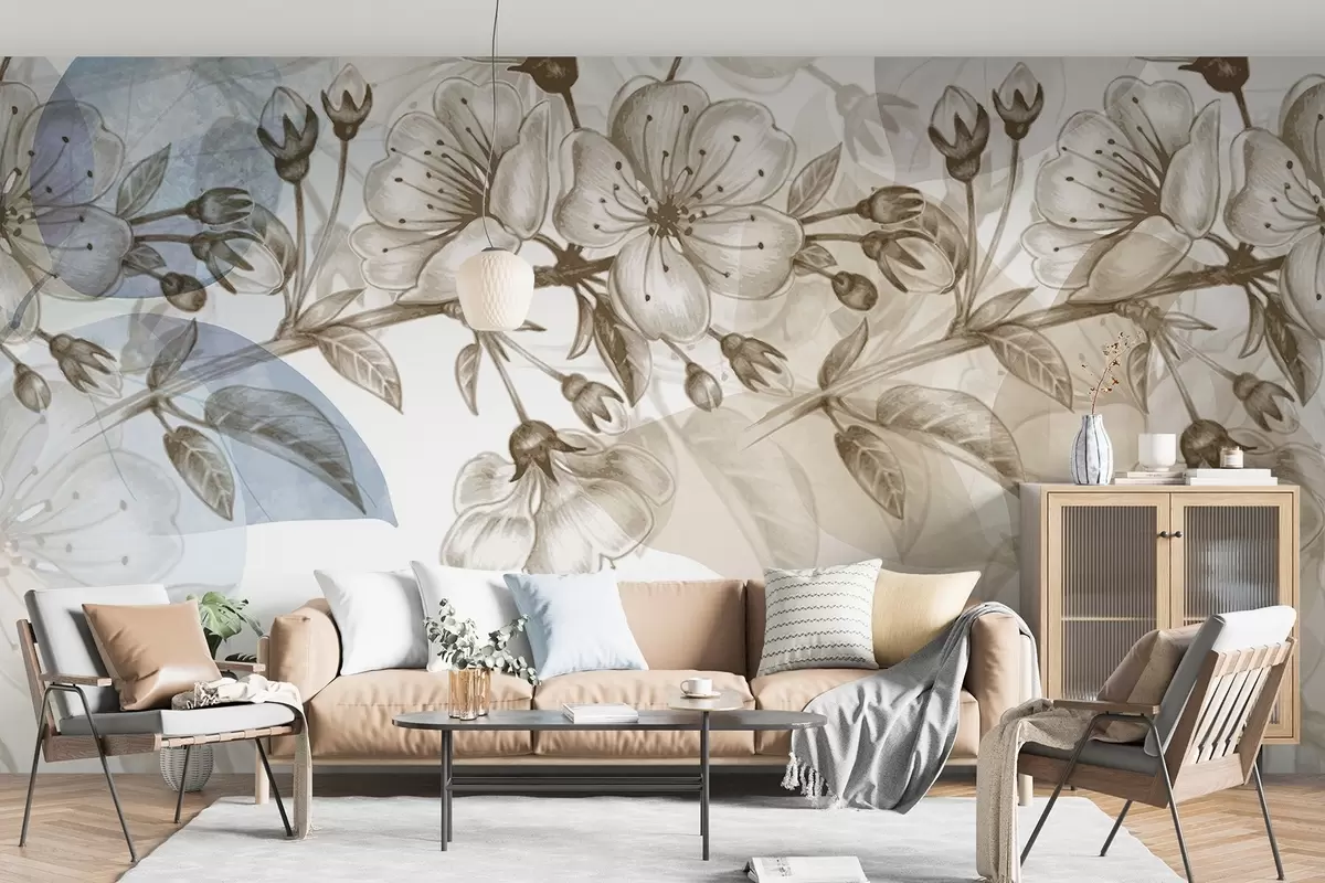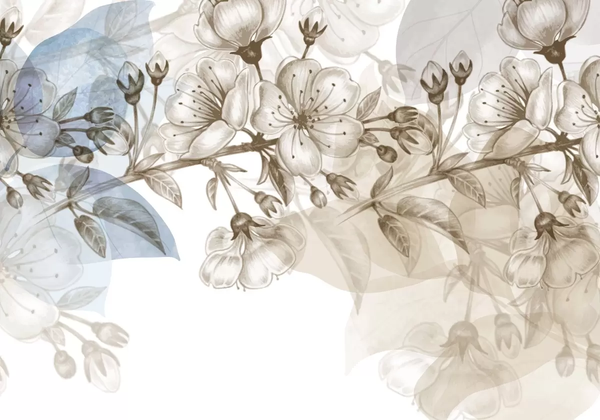 Fotomurales Ramo de cerezo con flores y capullos, tonos sepia, fondo suave tipo acuarela con tonos azules y marrones Nr. w09051
