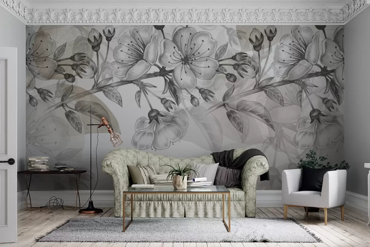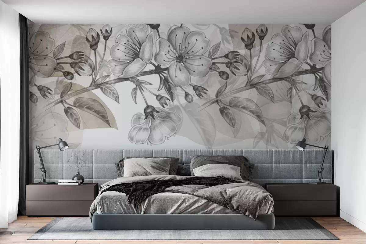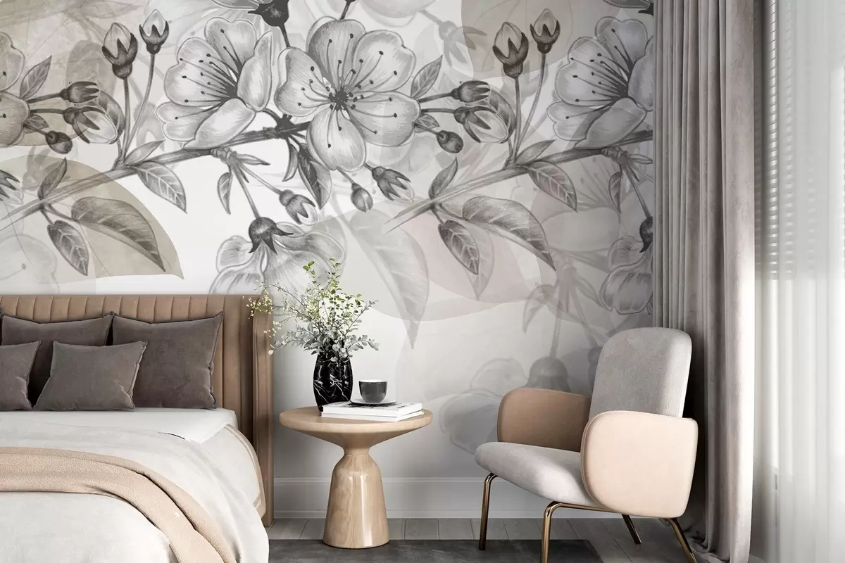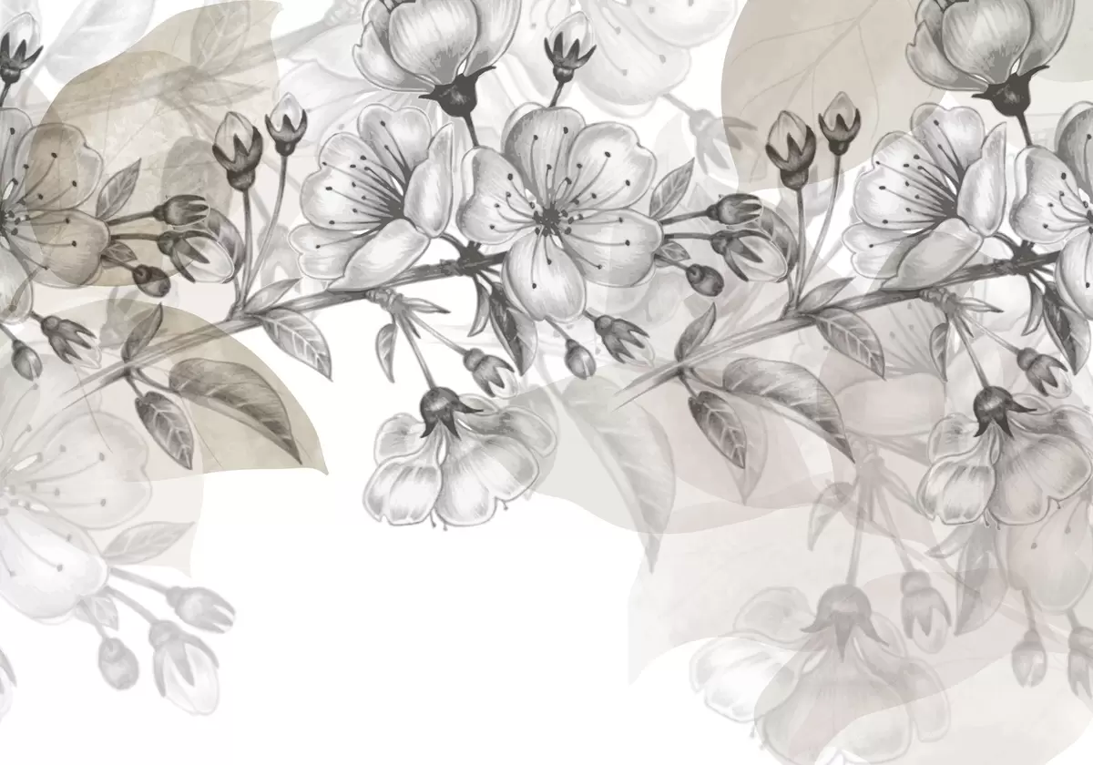 Fotomurales Ramo de cerezo con flores y capullos, tonos sepia, fondo suave tipo acuarela con tonos grises y marrones Nr. w09051v1