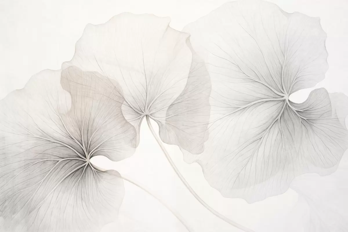 Fotomurales Tres hojas translúcidas con venas visibles, con textura de ruido superpuestas ligeramente, con tallos finos sobre fondo blanco Nr. w09052