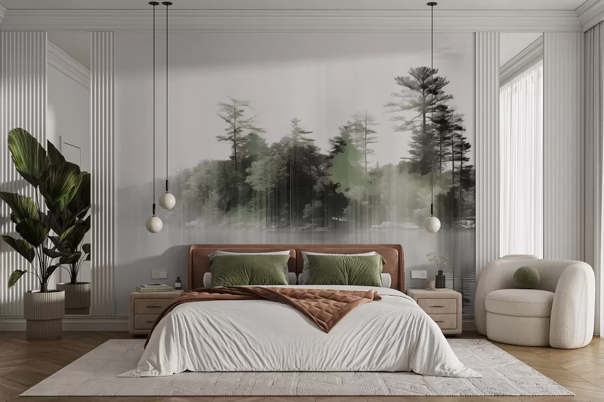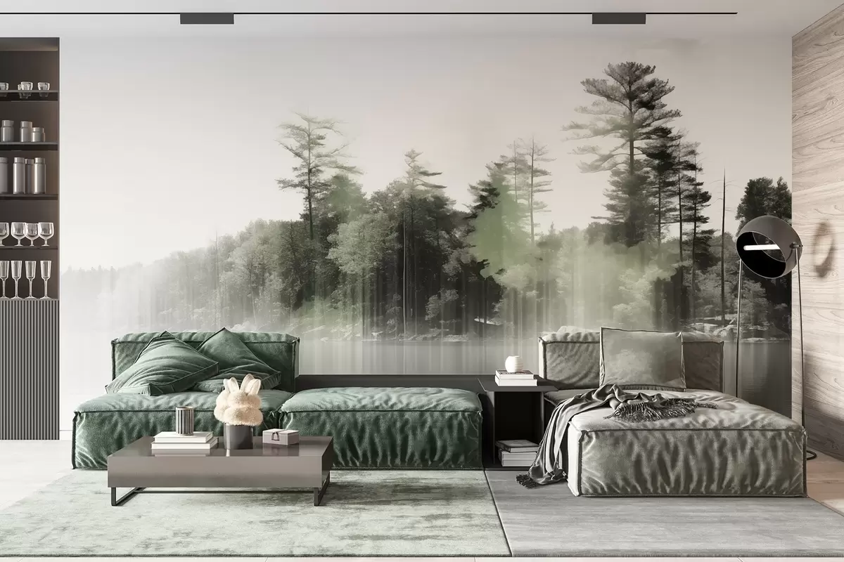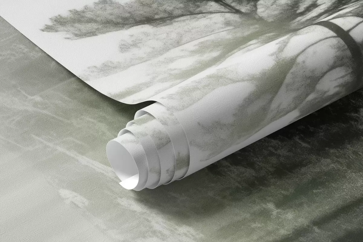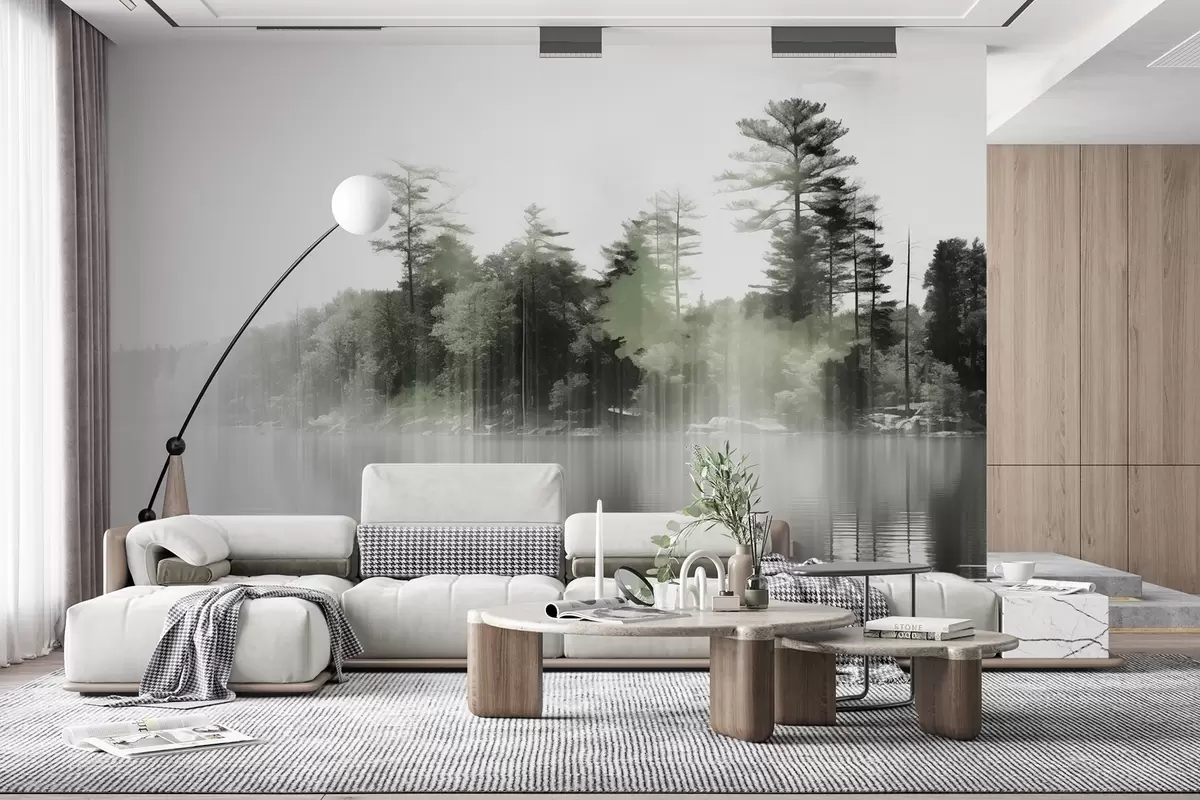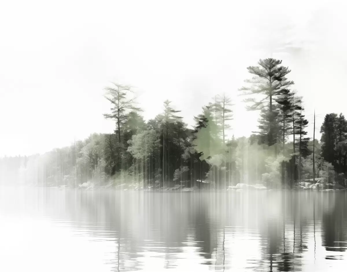 Fotomurales Paisaje abstracto minimalista texturizado con un lago y árboles reflejados en el agua en tonos verdes y blancos Nr. w09058