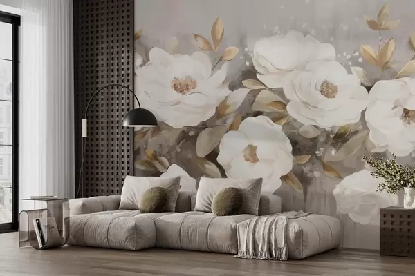 Fotomurales Flores blancas con hojas amarillas, pétalos suaves, delicado arreglo floral, paleta de colores neutros, pinceladas texturizadas Nr. w09062