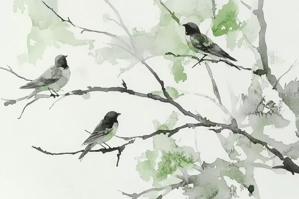 Fotomurales Pájaros en las ramas de los árboles en estilo acuarela Nr. w09064v3