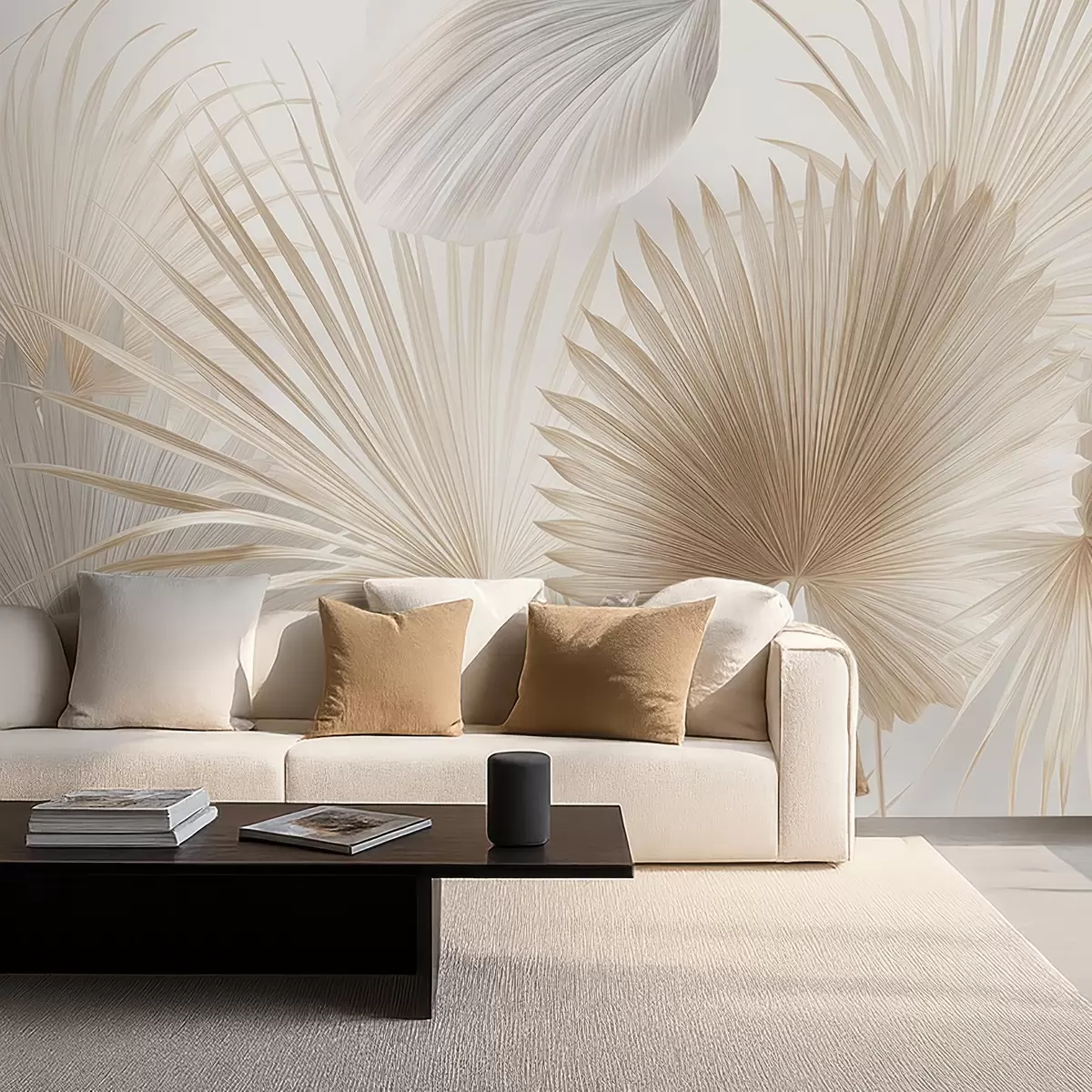 Fotomurales Suaves abanicos de hojas tropicales en tonos beige claro y azulados Nr. w09084