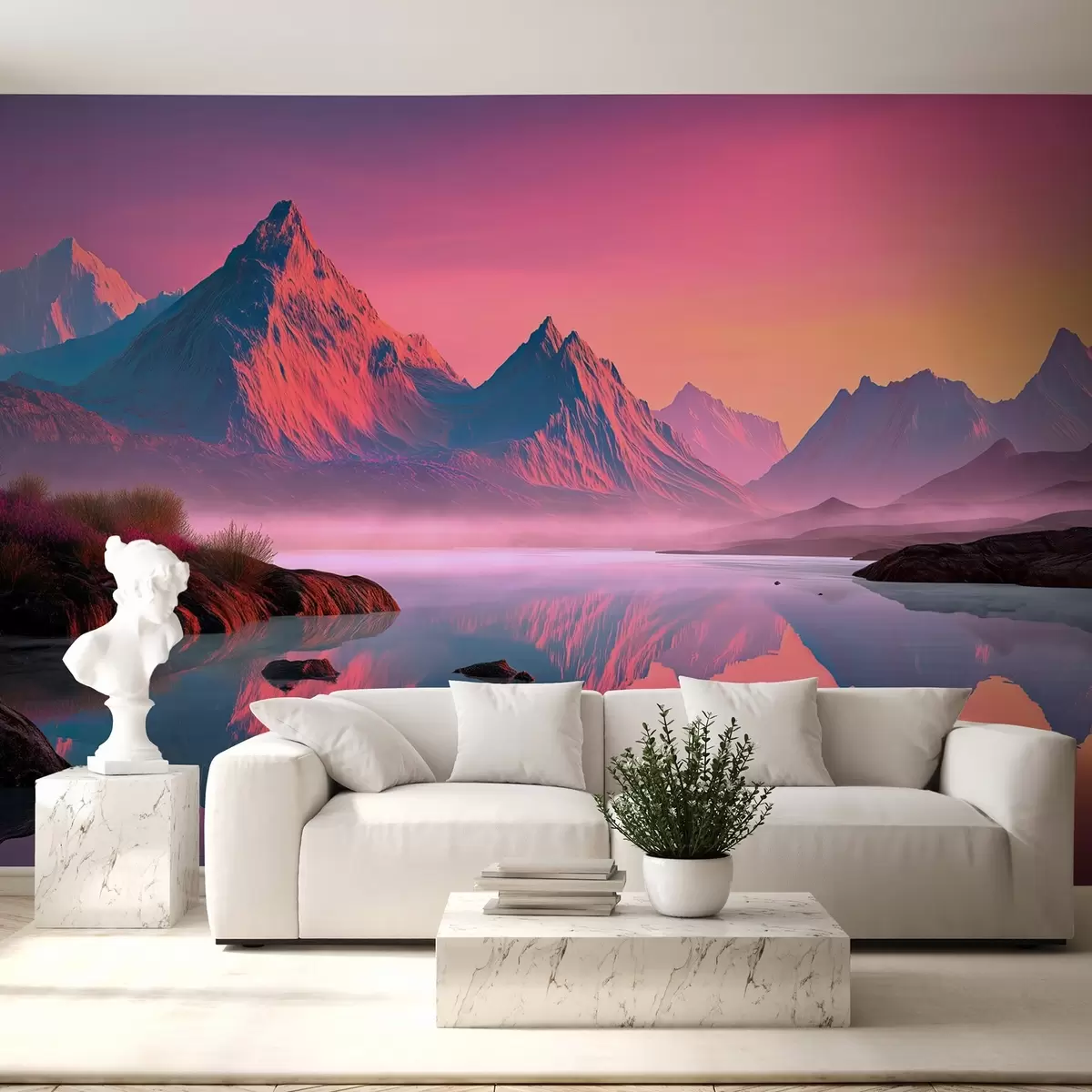Fotomurales Romántico paisaje al atardecer con un río y montañas en tonos rosados Nr. w09093