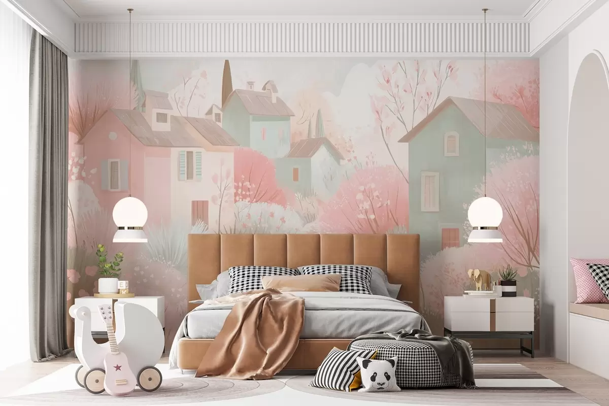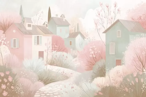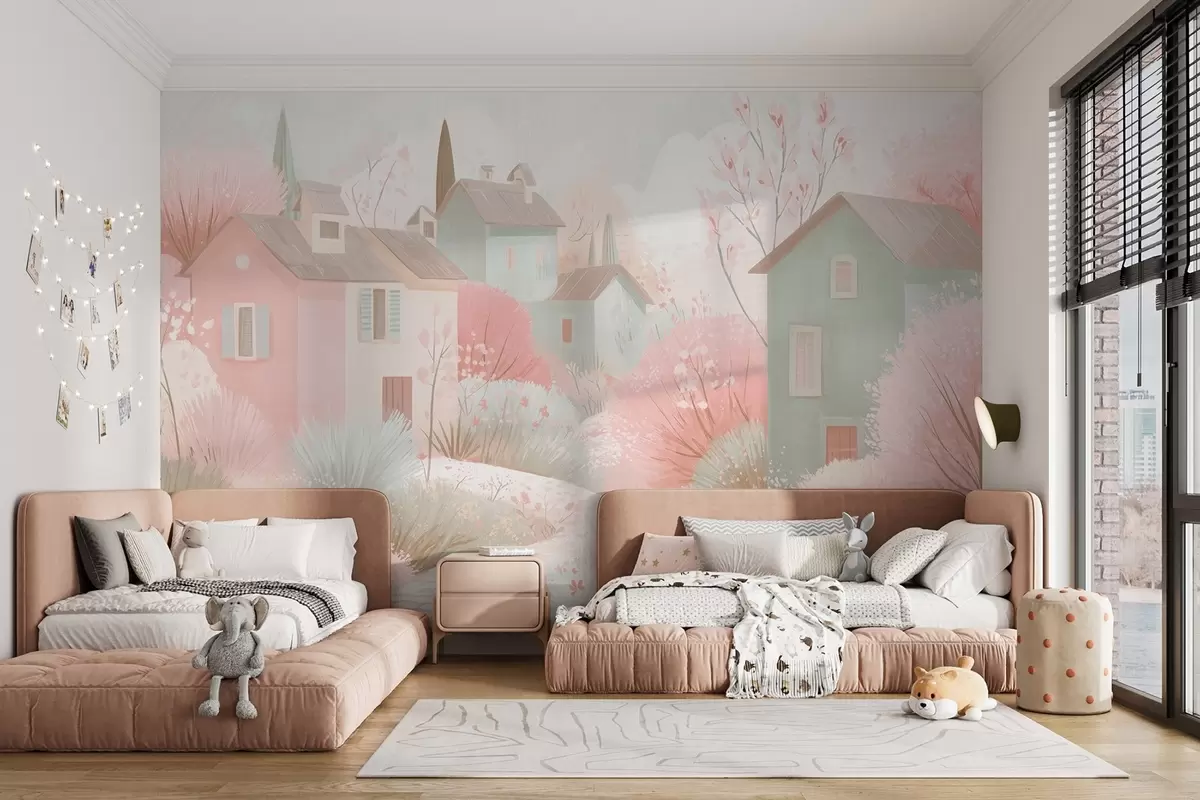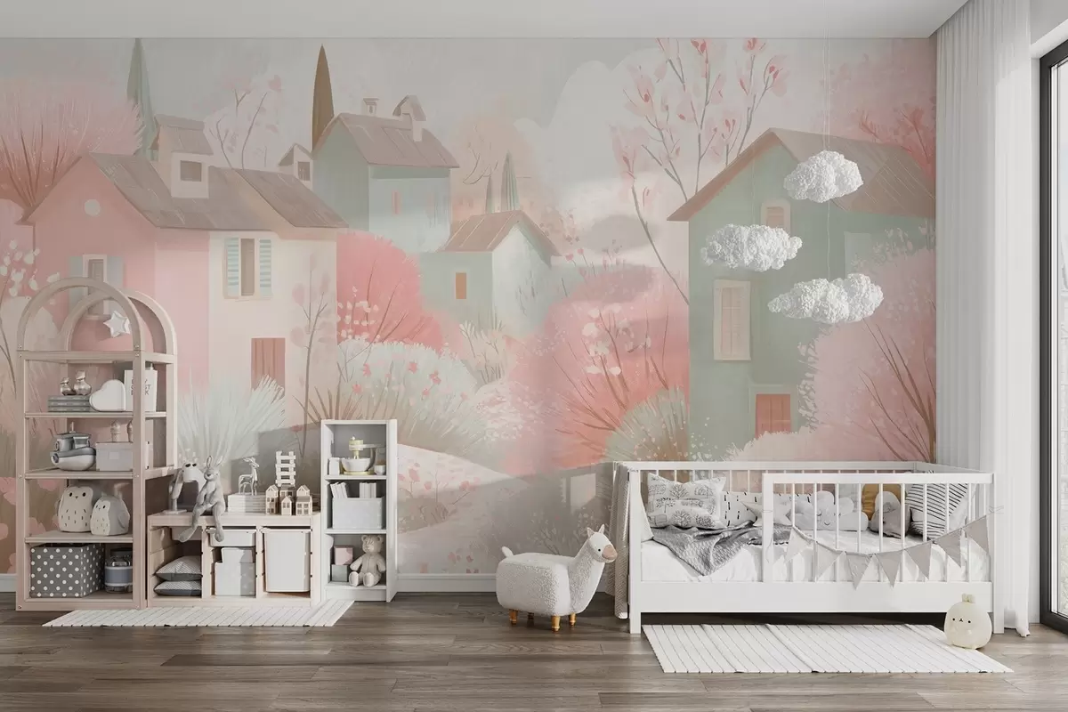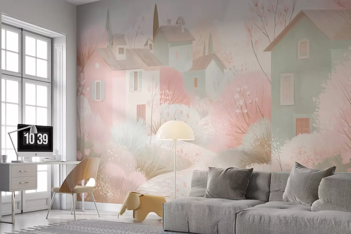 Fotomurales Ciudad de cuento al óleo en tonos rosas Nr. w09095