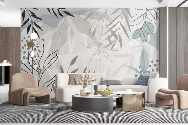Fotomurales Diseño floral abstracto moderno con hojas de color beige pastel, gris, azul y negro, delicado arte lineal y fondo suave Nr. w09105