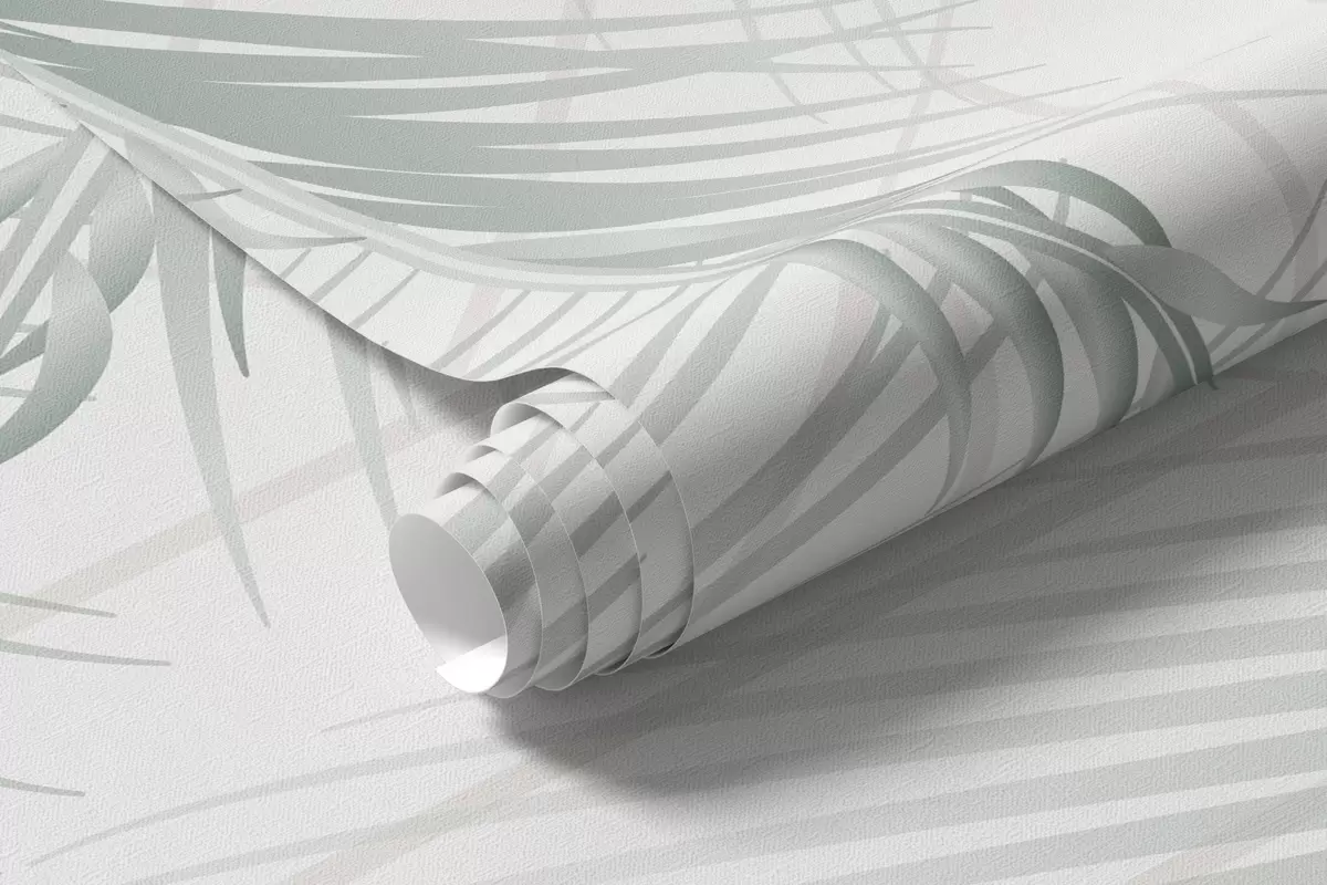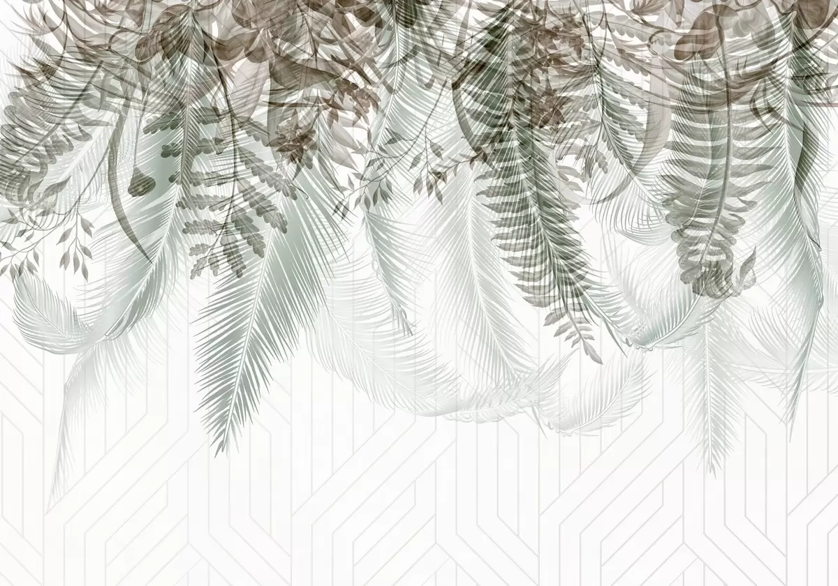 Fotomurales Delicada caída de helechos tropicales y hojas de palmera, fondo geométrico, luz suave, colores apagados, elegante Nr. w09106v1