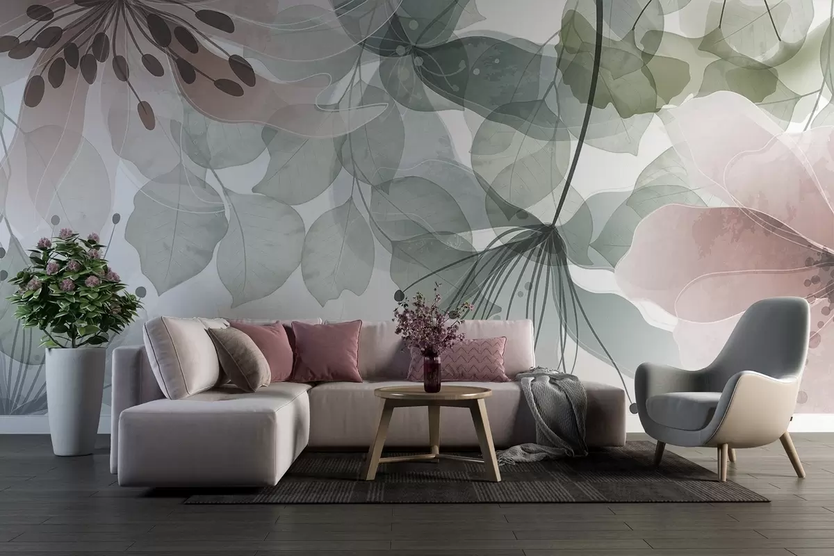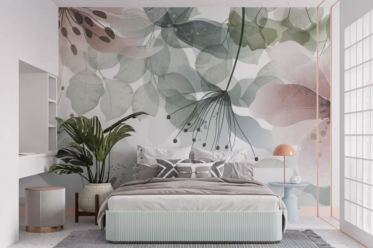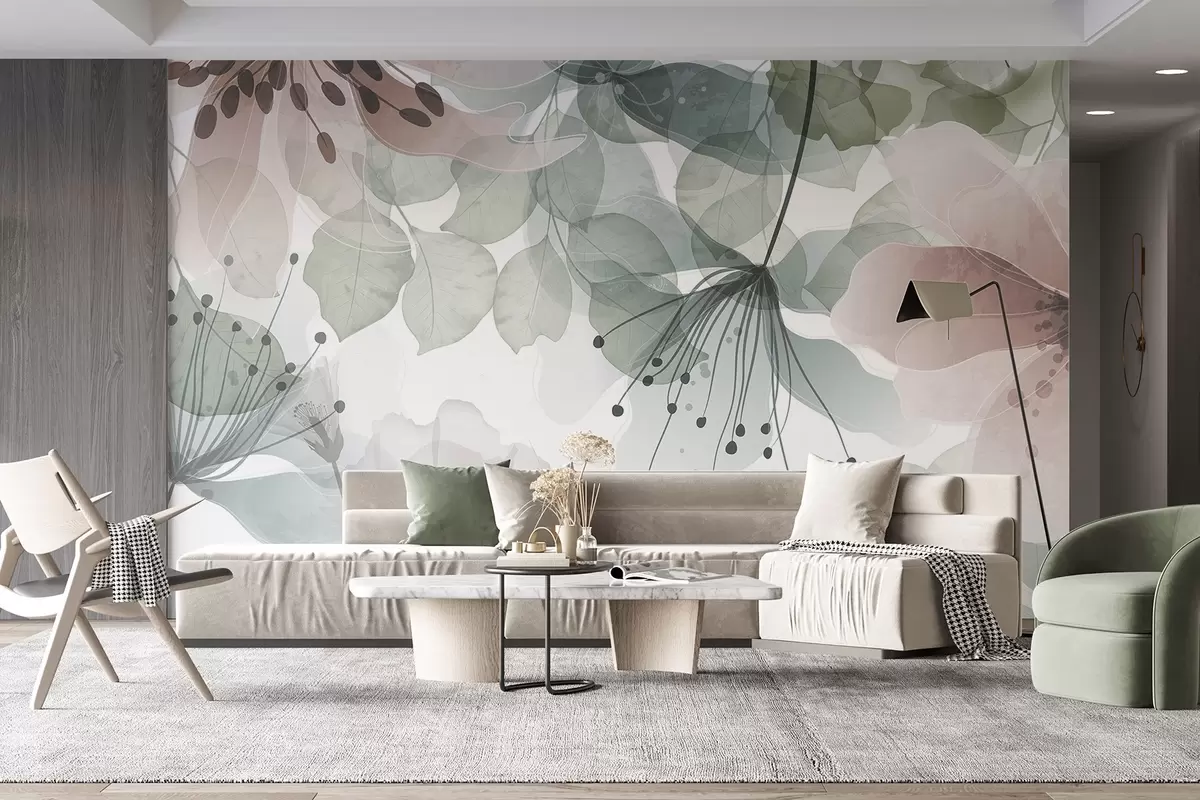 Fotomurales Flores y hojas en colores pastel, pétalos y hojas translúcidos, suave efecto acuarela, líneas delicadas, fondo blanco Nr. w09107