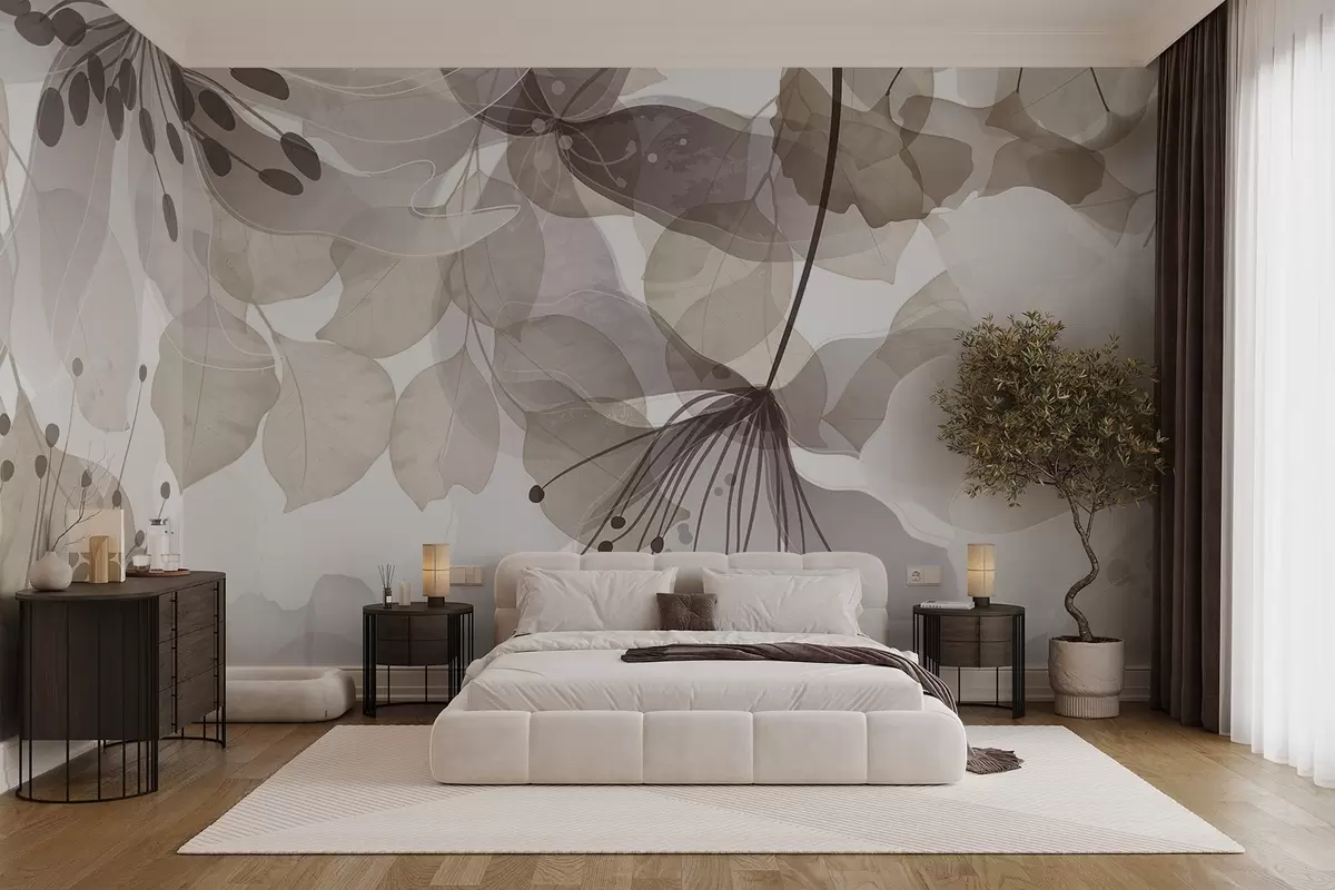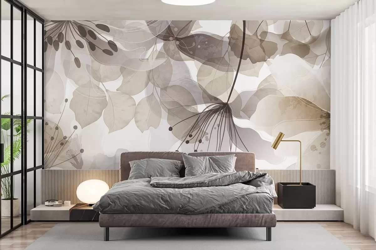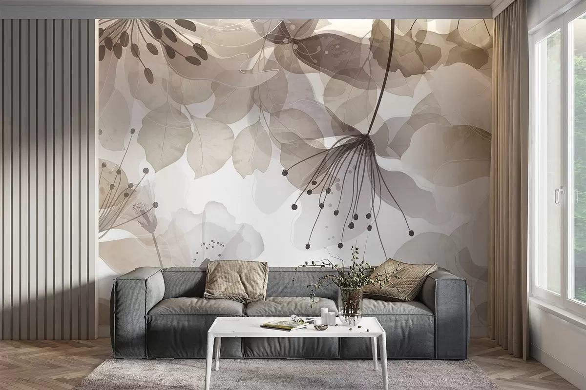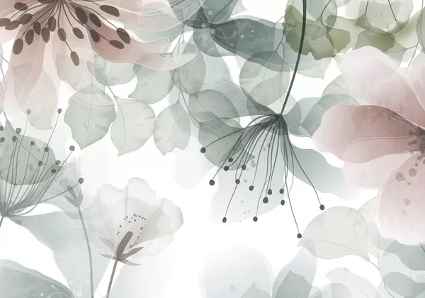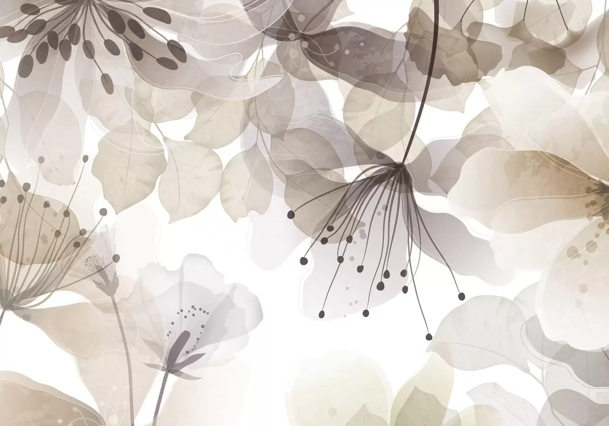 Fotomurales Flores y hojas en colores beige, pétalos y hojas translúcidos, suave efecto acuarela, líneas delicadas, fondo blanco Nr. w09107v1