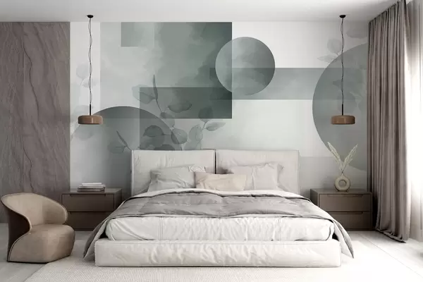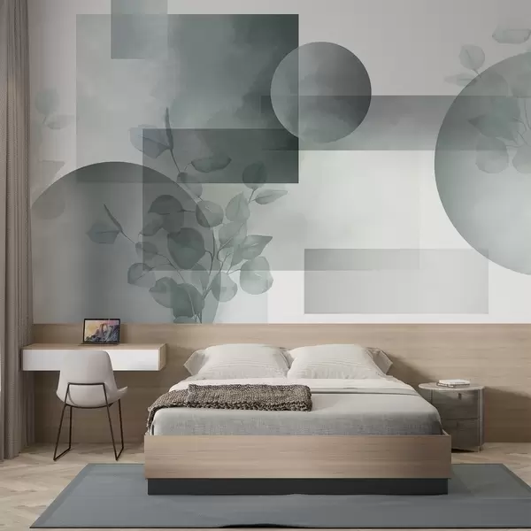 Fotomurales Diseño geométrico minimalista moderno abstracto con círculos y rectángulos, hojas de eucalipto, efecto acuarela Nr. w09110