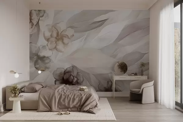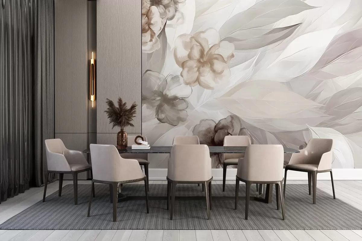 Fotomurales Delicadas flores y hojas en tonos blancos, marrones y beige, fondo floral, colores suaves y delicados pétalos Nr. w09111v1