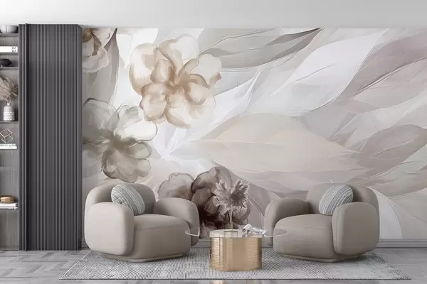 Fotomurales Delicadas flores y hojas en tonos blancos, marrones y beige, fondo floral, colores suaves y delicados pétalos Nr. w09111v1