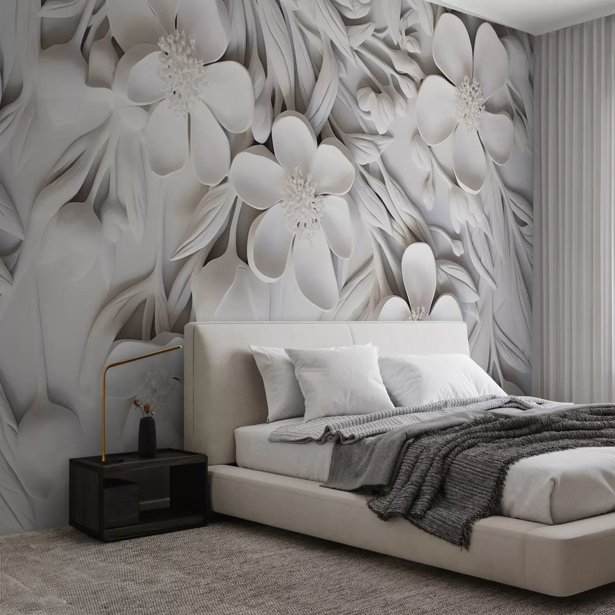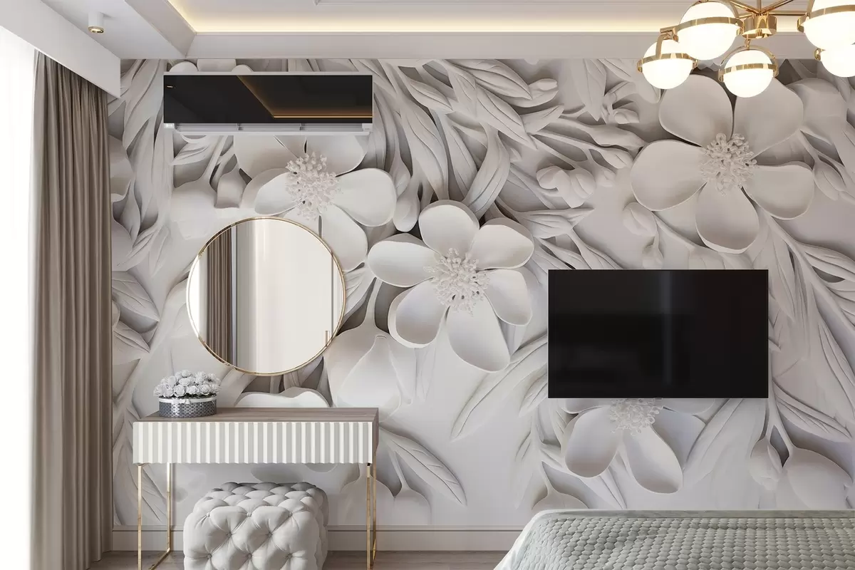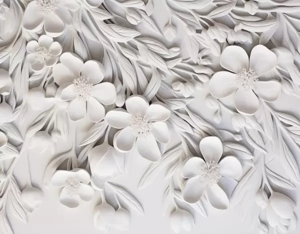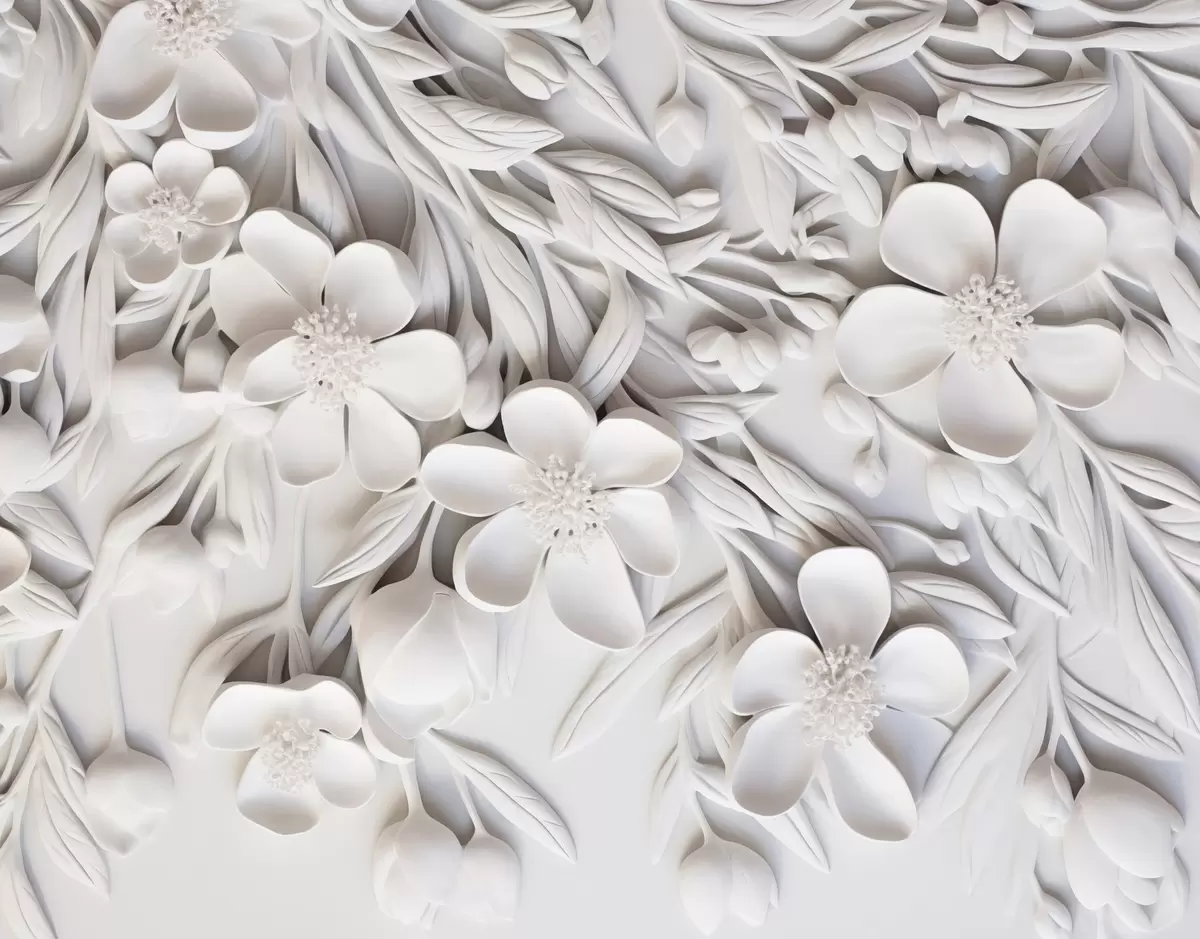 Fotomurales Flores blancas y hojas en un fondo blanco, floral elegante, diseño decorativo, detalles intrincados Nr. w09113