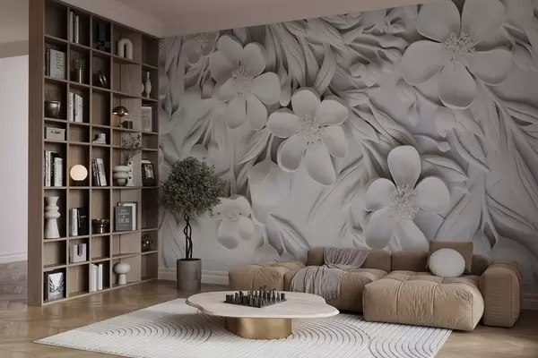 Fotomurales Flores blancas y hojas en un fondo blanco, floral elegante, diseño decorativo, detalles intrincados Nr. w09113