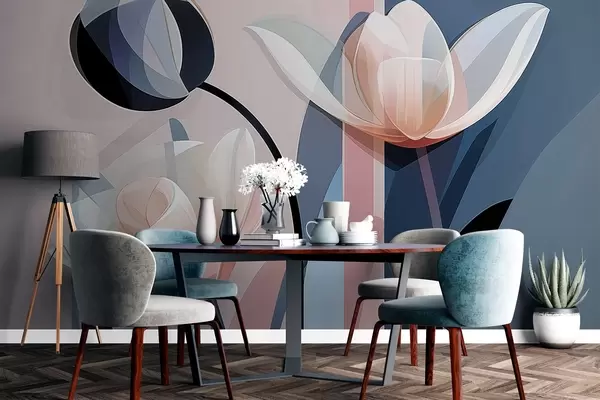Fotomurales Diseño moderno abstracto con tulipanes de pétalos transparentes en tonos pastel rosa, blanco y azul oscuro Nr. w09116