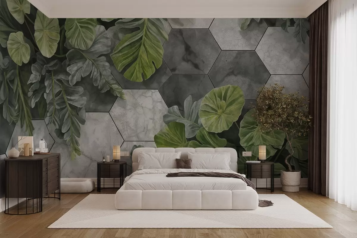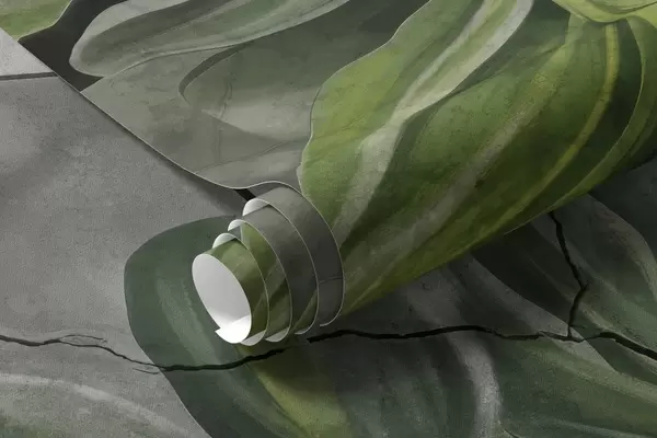 Fotomurales Hojas verdes tropicales y plantas sobre un fondo de azulejos grises y blancos con textura, exuberante follaje diseño moderno Nr. w09117