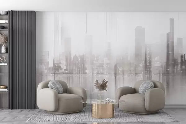 Fotomurales Paisaje urbano abstracto texturizado con edificios altos y franjas, en tonos grises y blancos, creando un efecto brumoso Nr. w09119