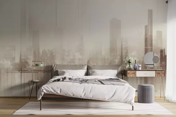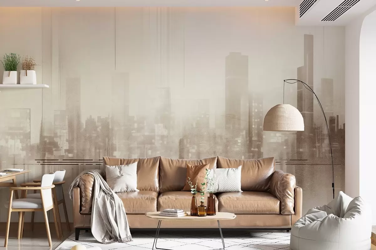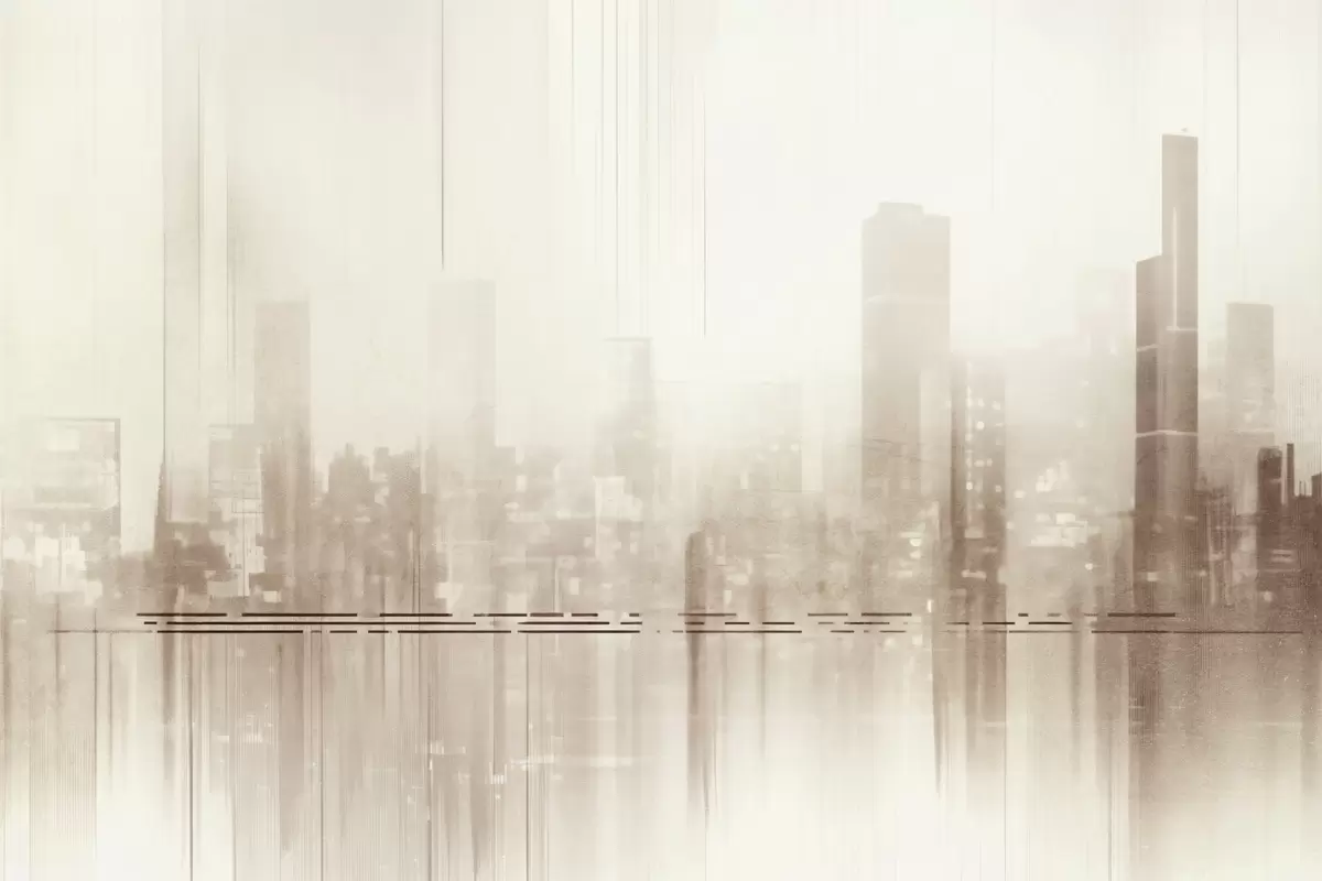 Fotomurales Paisaje urbano abstracto texturizado con edificios altos y bandas, en tonos beige y blanco, creando un efecto brumoso Nr. w09119v1