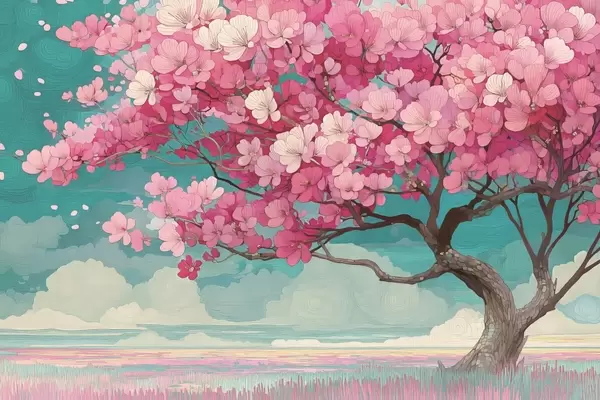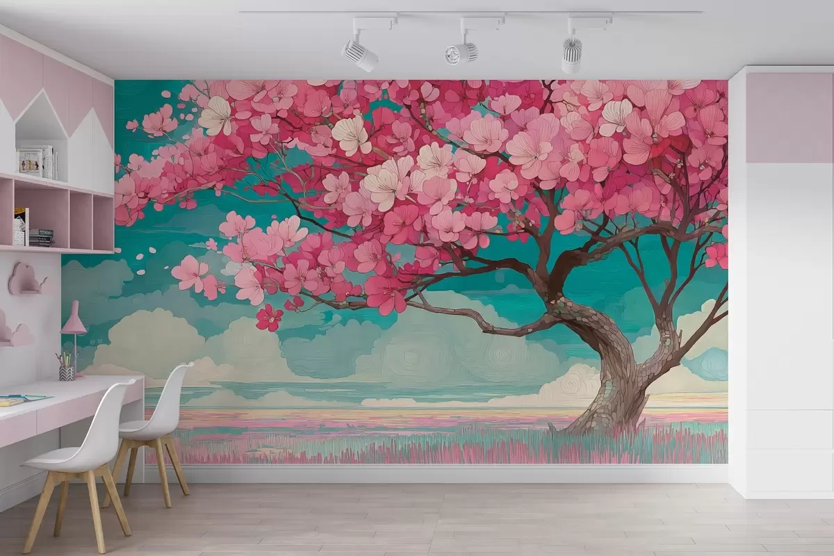 Fotomurales Un cerezo rosa en flor con pétalos que caen y un cielo azul de estilo romántico Nr. w09120