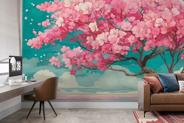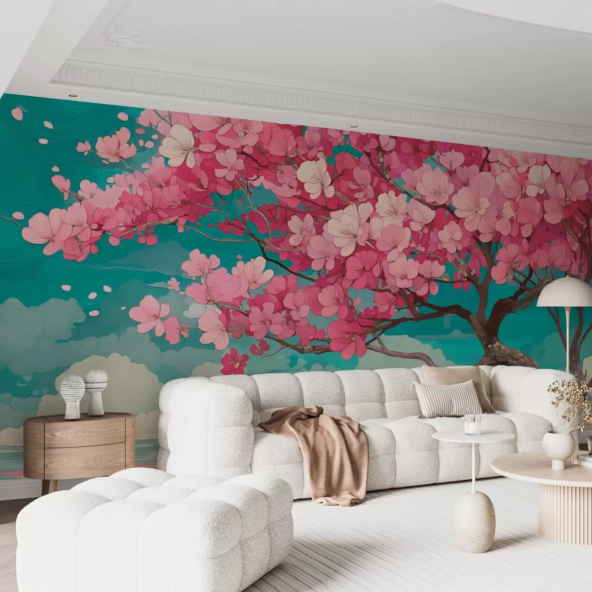 Fotomurales Un cerezo rosa en flor con pétalos que caen y un cielo azul de estilo romántico Nr. w09120