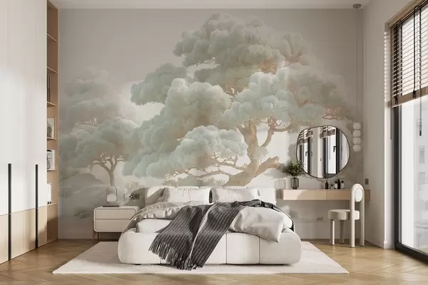 Fotomurales Pinos en la niebla en tonos suaves de pie en un bosque Nr. w09122