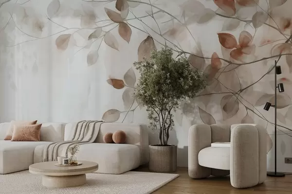Fotomurales Pintura en acuarela con textura imitando hojas y ramas marrones, colores suaves, detalles delicados sobre fondo blanco Nr. w09133