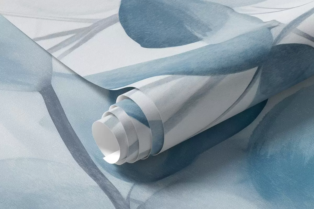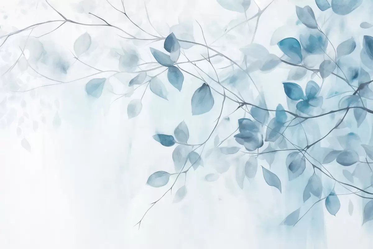 Fotomurales Pintura en acuarela con textura imitando hojas y ramas azules, colores suaves, detalles delicados sobre fondo blanco Nr. w09133v1