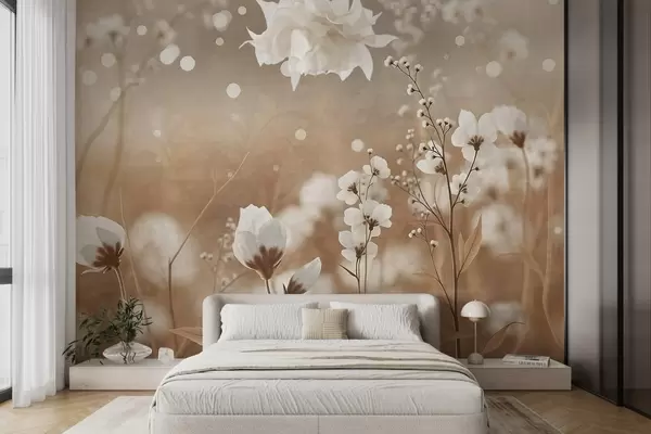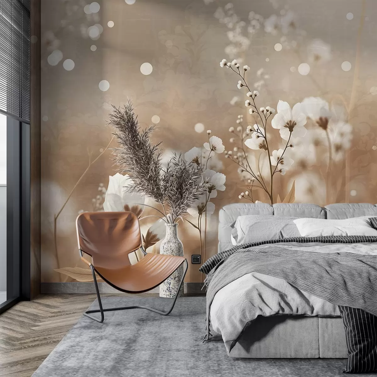 Fotomurales Flores blancas con tallos y hojas marrones en un campo, efecto bokeh, paleta de colores cálidos, elegante obra de arte inspirada en la naturaleza Nr. w09135