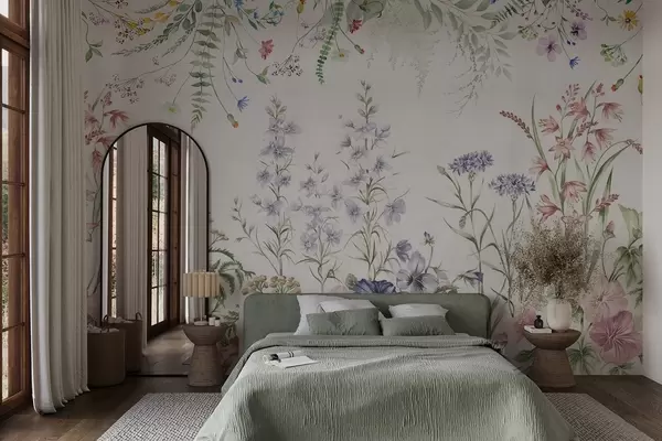 Fotomurales Arreglo floral de textura con flores de colores y hojas verdes, ilustración botánica , colores pastel suaves, estilo vintage Nr. w09143