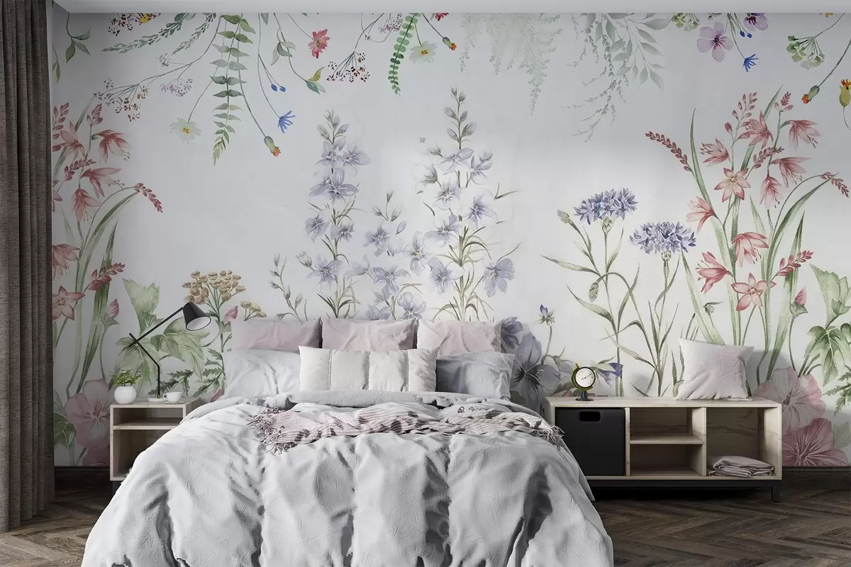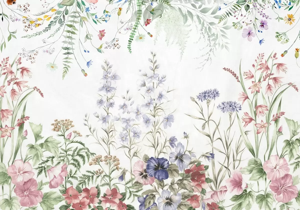 Fotomurales Arreglo floral de textura con flores de colores y hojas verdes, ilustración botánica , colores pastel suaves, estilo vintage Nr. w09143