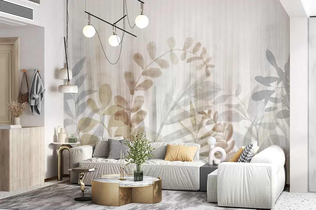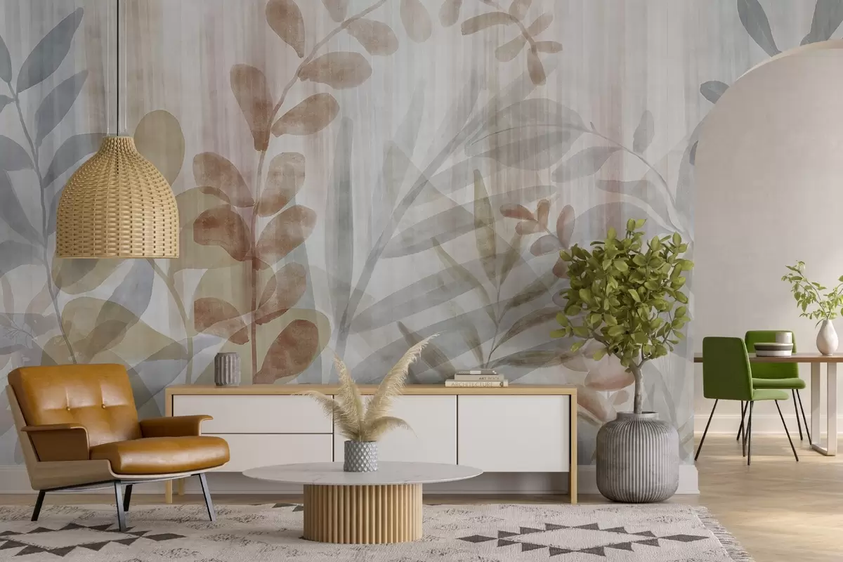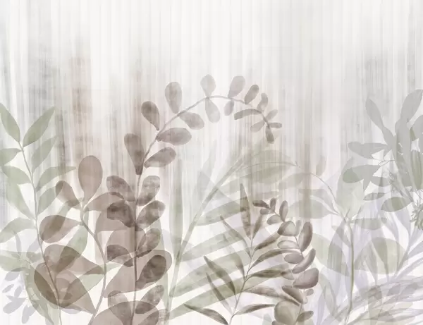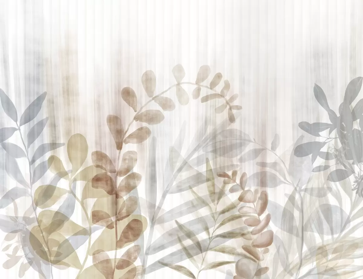 Fotomurales Pintura acuarela imitación de plantas con hojas multicolores apagadas, fondo claro con líneas verticales, ilustración botánica Nr. w09146