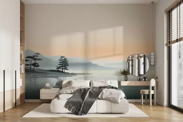 Fotomurales Paisaje minimalista con montañas neblinosas y un lago Nr. w09151