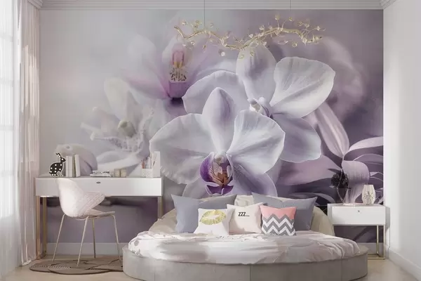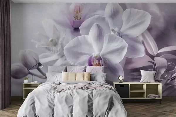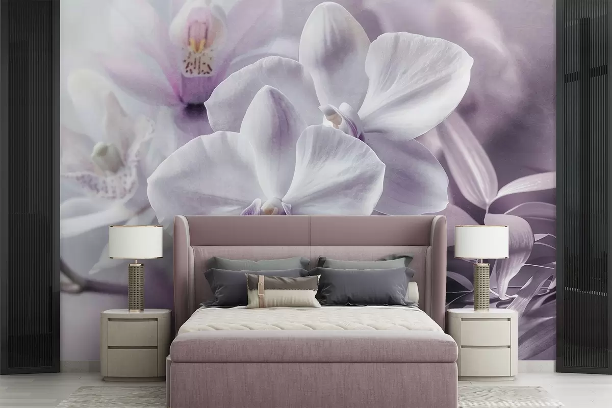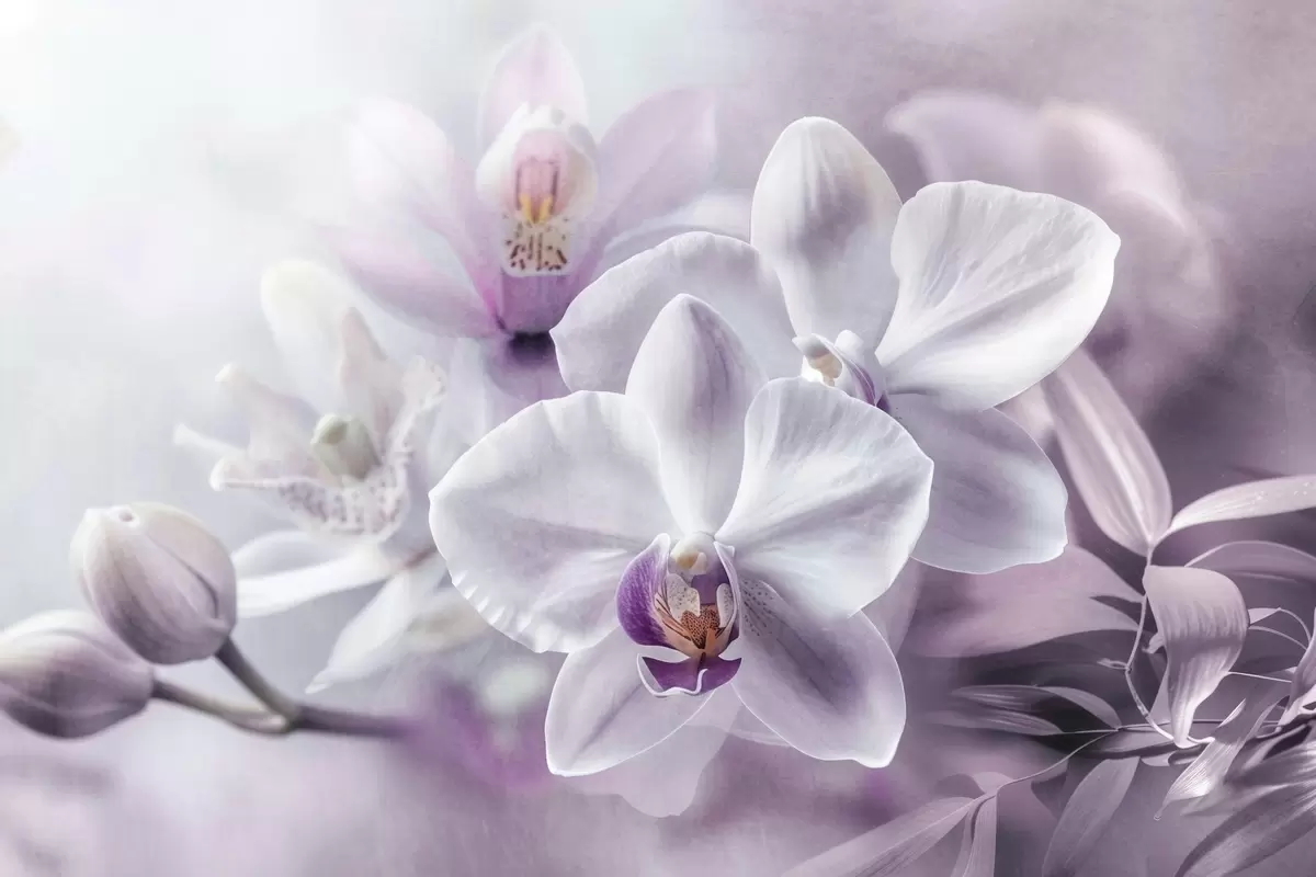 Fotomurales Delicadas flores de orquídea blancas y lilas, iluminación suave y fondo difuminado con textura Nr. w09155